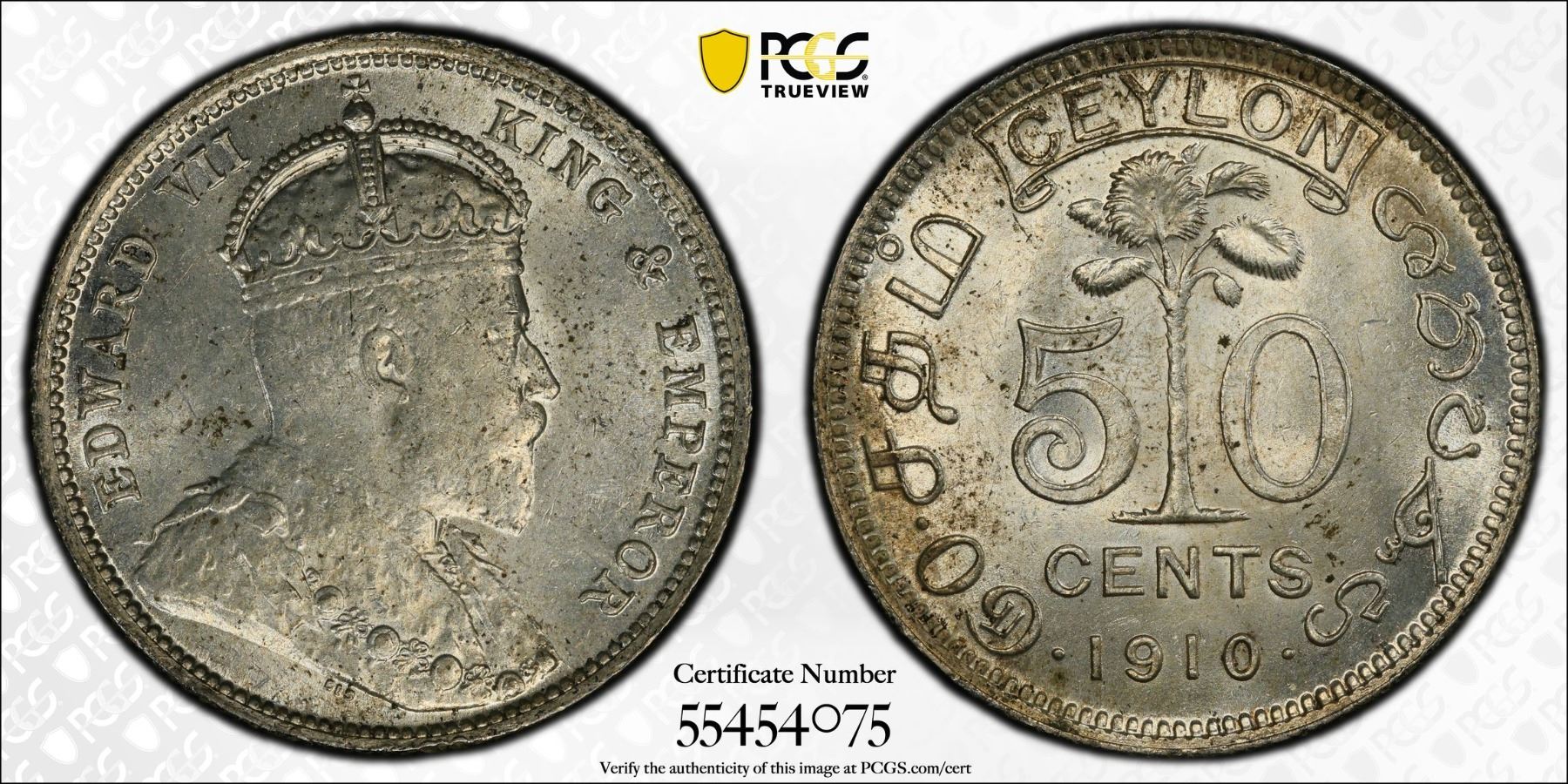 CEYLON: Edward VII, 1901-1910, AR 50 cents, 1910, PCGS MS62