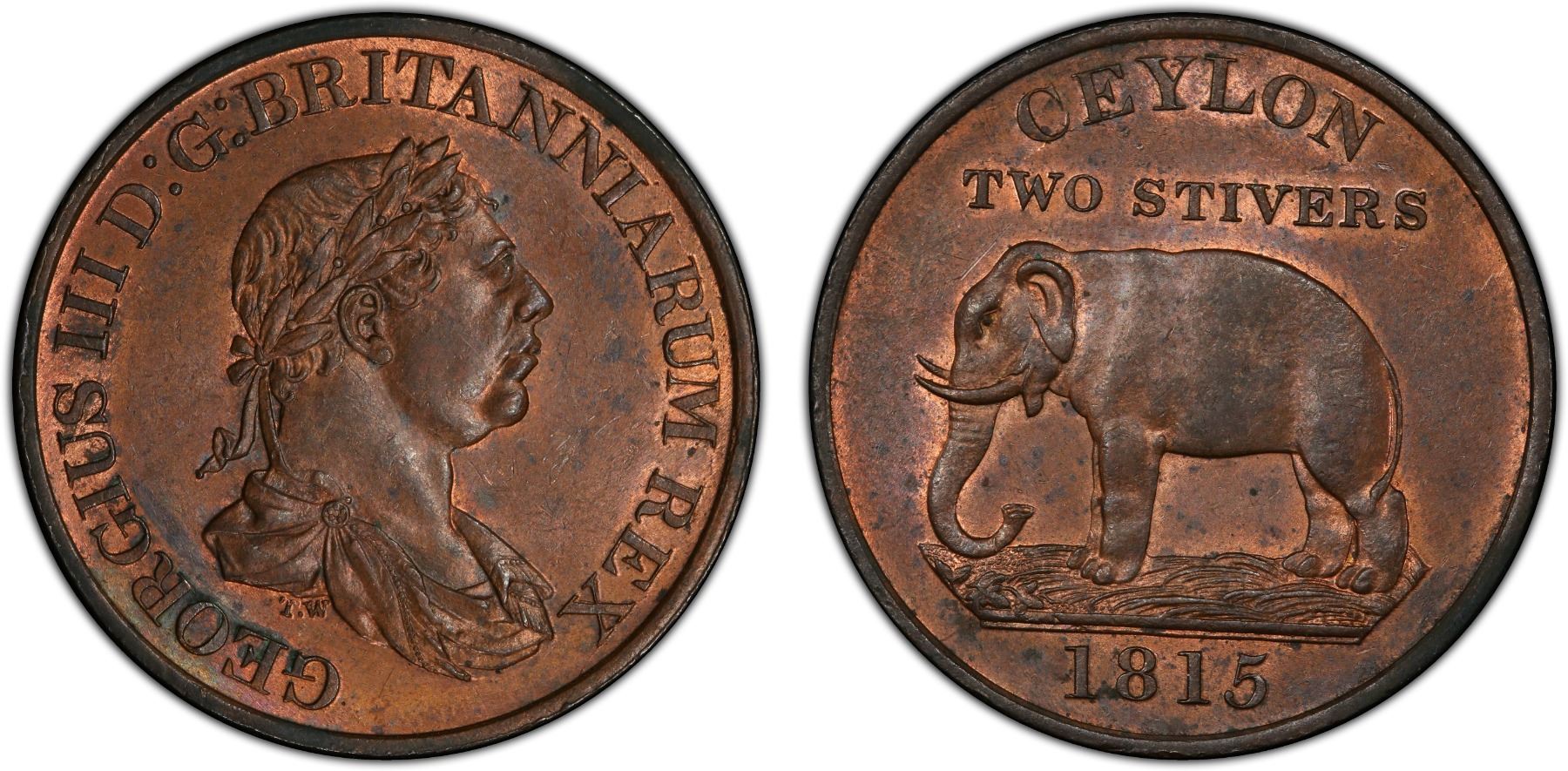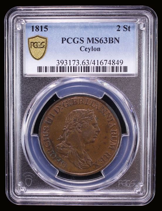 CEYLON: George III, 1760-1820, AE 2 stivers, 1815, KM-82, Prid-90, a lovely red and brown lustrous example! PCGS graded MS64 RB. This is a stunning example in a remarkable state of preservation; only two examples are graded higher at PCGS and only one is tied with this grade, so it is among the top four graded with PCGS.