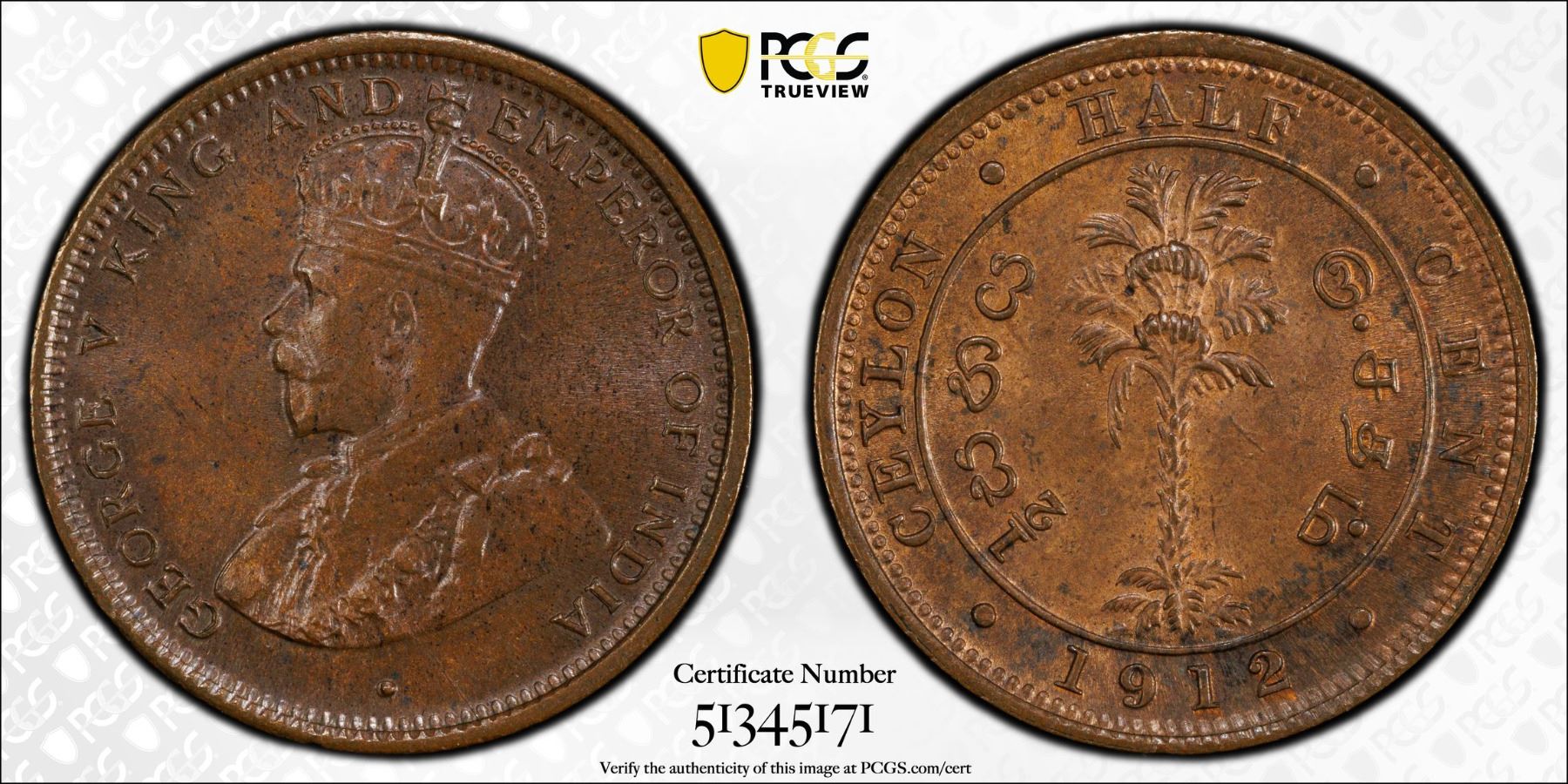 CEYLON: George V, 1910-1936, AE 1/2 cent, 1912, KM-106, a wonderful mint state example! PCGS graded MS64 BN.