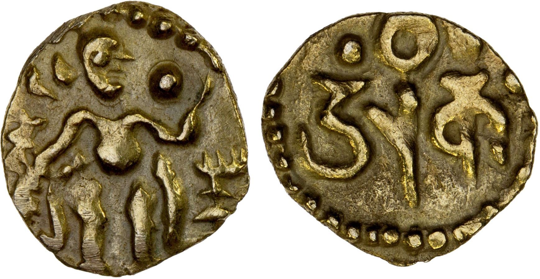 CEYLON (MEDIEVAL): Anonymous, ca. 990-1100+, AV aka (1/8 kahavanu) (0.51g), Mitch-828/30, King standing right, holding globe with left hand // Nagari legend uraka, circle above, XF.
