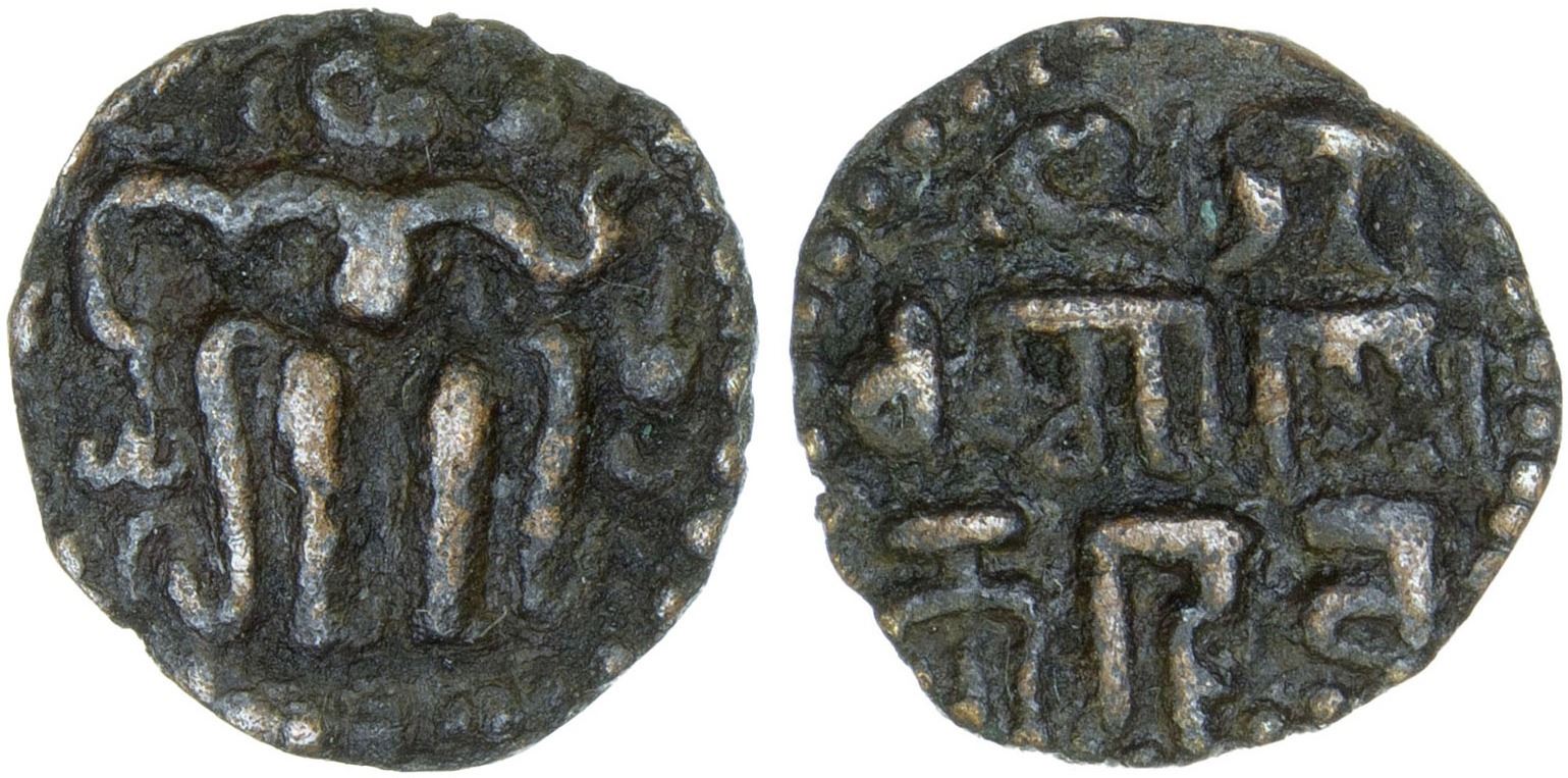 CEYLON (MEDIEVAL): Dharmasoka, 1208-1209, AE 1/8 massa (0.49g), Mitch-, Zeno-30711, 3-line legend dhammasoka deva // king standing; denomination also called 1/8 kahavanu, VF, RRR. There are no examples of this denomination on CoinArchives or ACSearch, just one on Zeno.