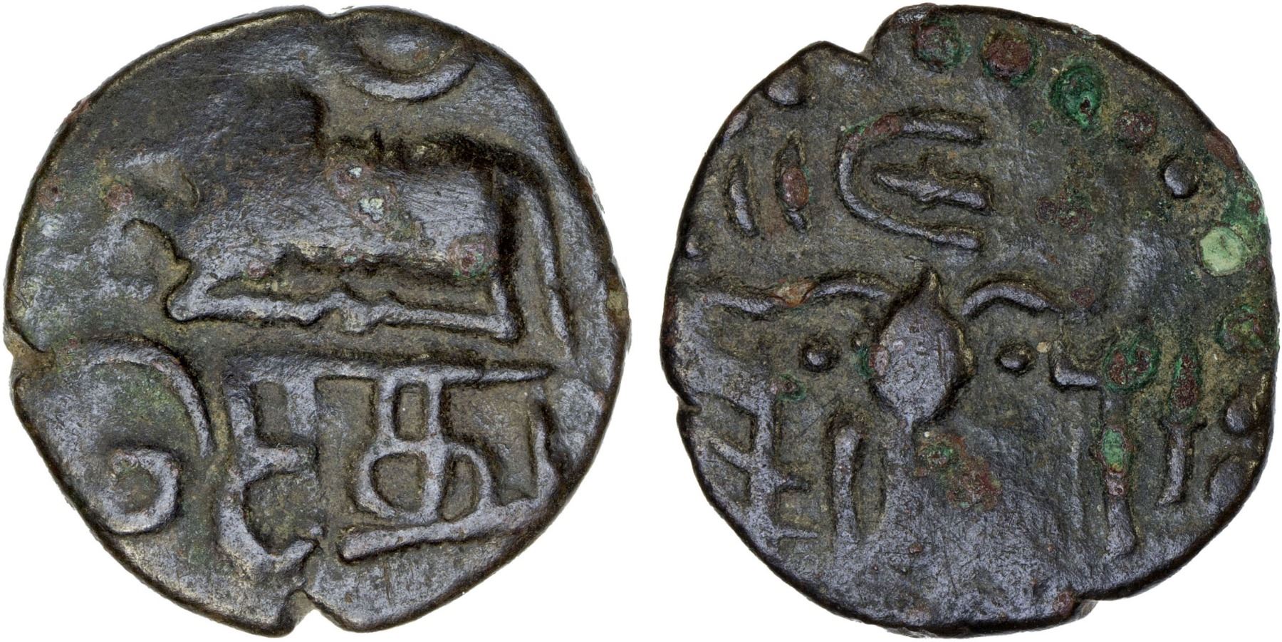 CEYLON: Medieval: Anonymous, ca. 1462-1597, AE unit (2.88g), Mitch-867/868, Arya Chakravarti of Jaffna series: humped bull seated left, dot in crescent above, legend setu below // traditional standing king; early version, VF, R.