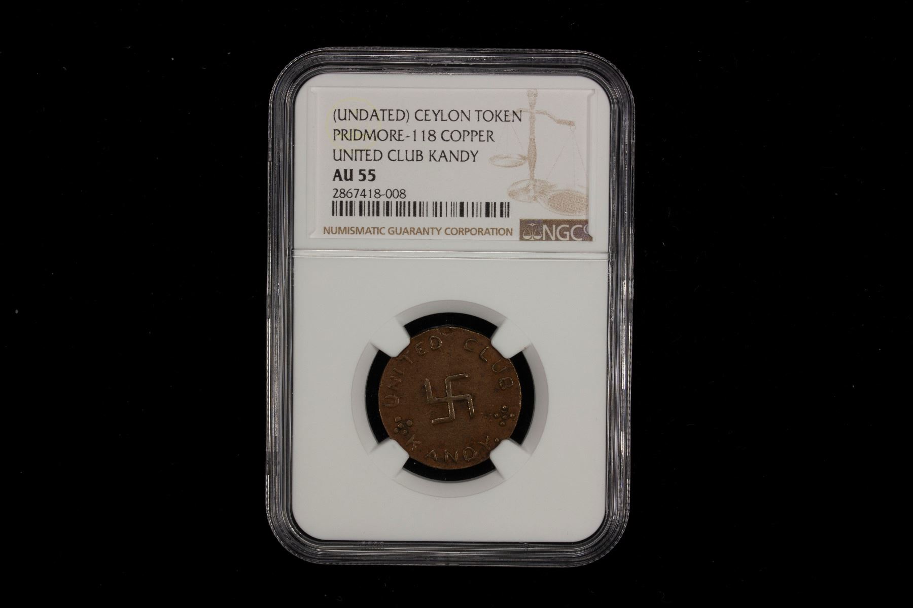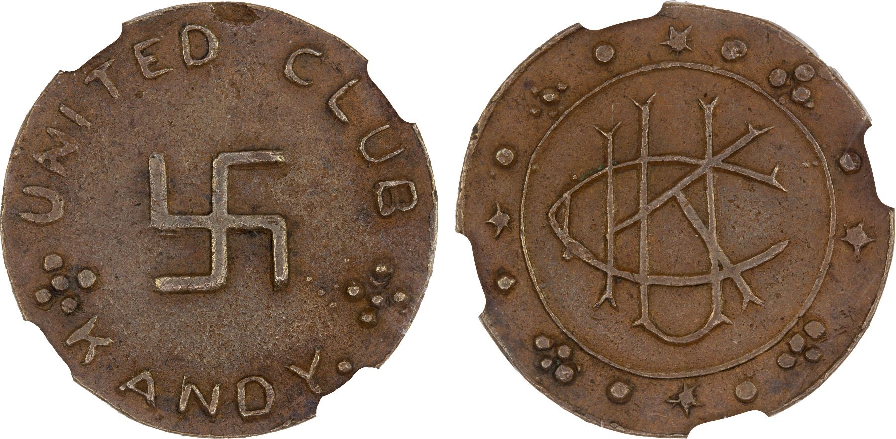 CEYLON: United Club Kandy, AE token, Prid-118, with swastika in obverse center, UCK logo on the reverse, NGC graded AU55, RR.