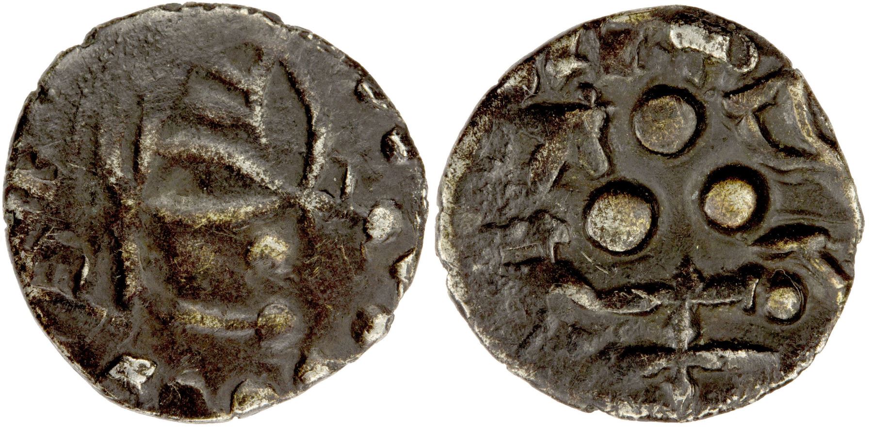 CHACH BRANCH AT MULTAN: Sri Tapanasa, before 712, AR damma (0.62g), FT-M7, variant A2, crowned bust with Brahmi letter pra on forehead // 3 pellets, stylized fire altar below, Brahmi sri tapanasa around, possibly a reference to the Sun Temple at Multan, VF, R.