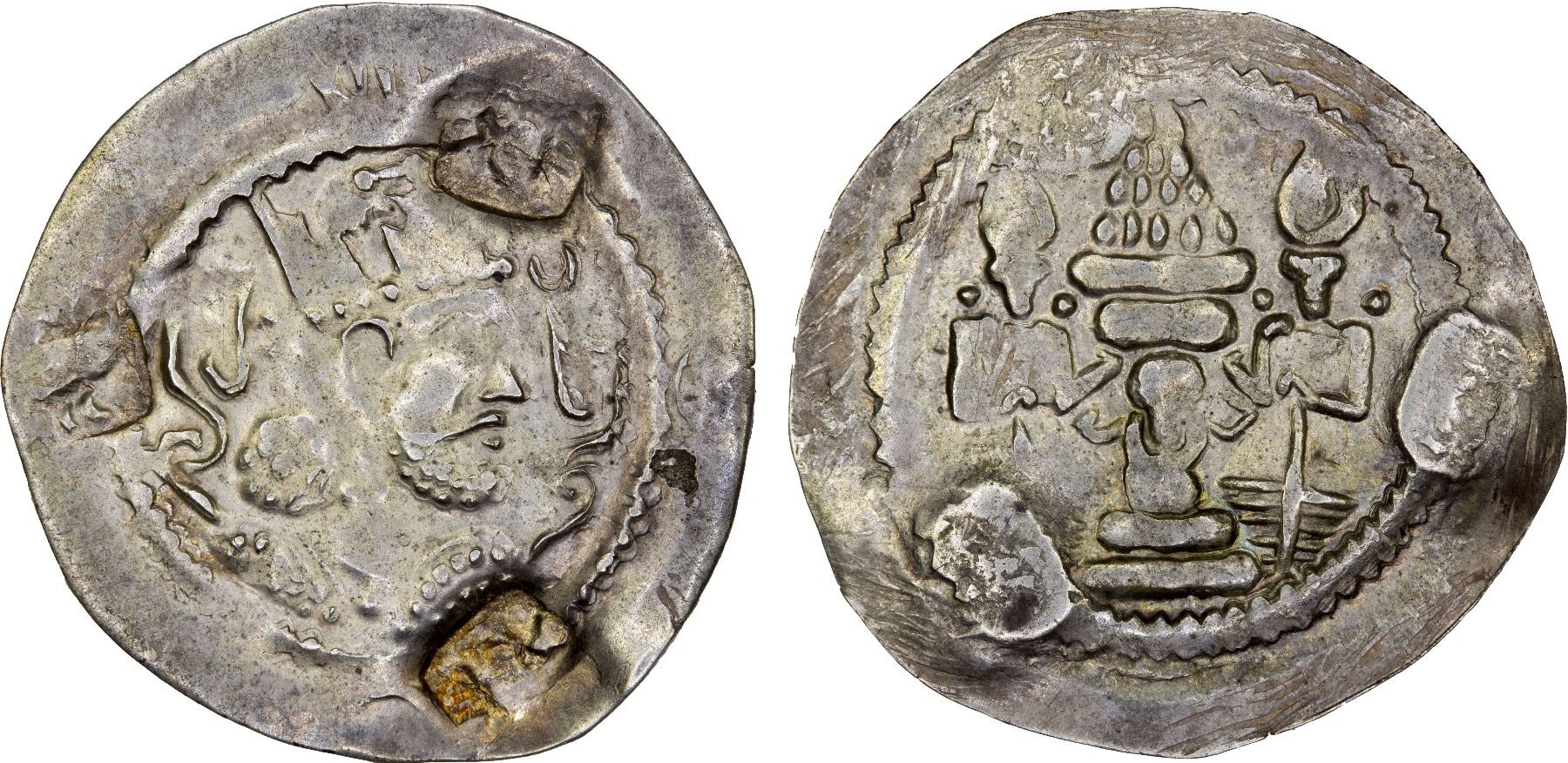 CHAGHANIAN: Anonymous, late 7th century, AR drachm (2.54g), Rtveladze-45, Zeno-53205, in the Northern Tokharistan region, now part of Tajikistan, derived from the standard dirham of the Sasanian Khusro I (531-579), countermark of three human heads in the obverse margin, XF, R, ex William F. Spengler.