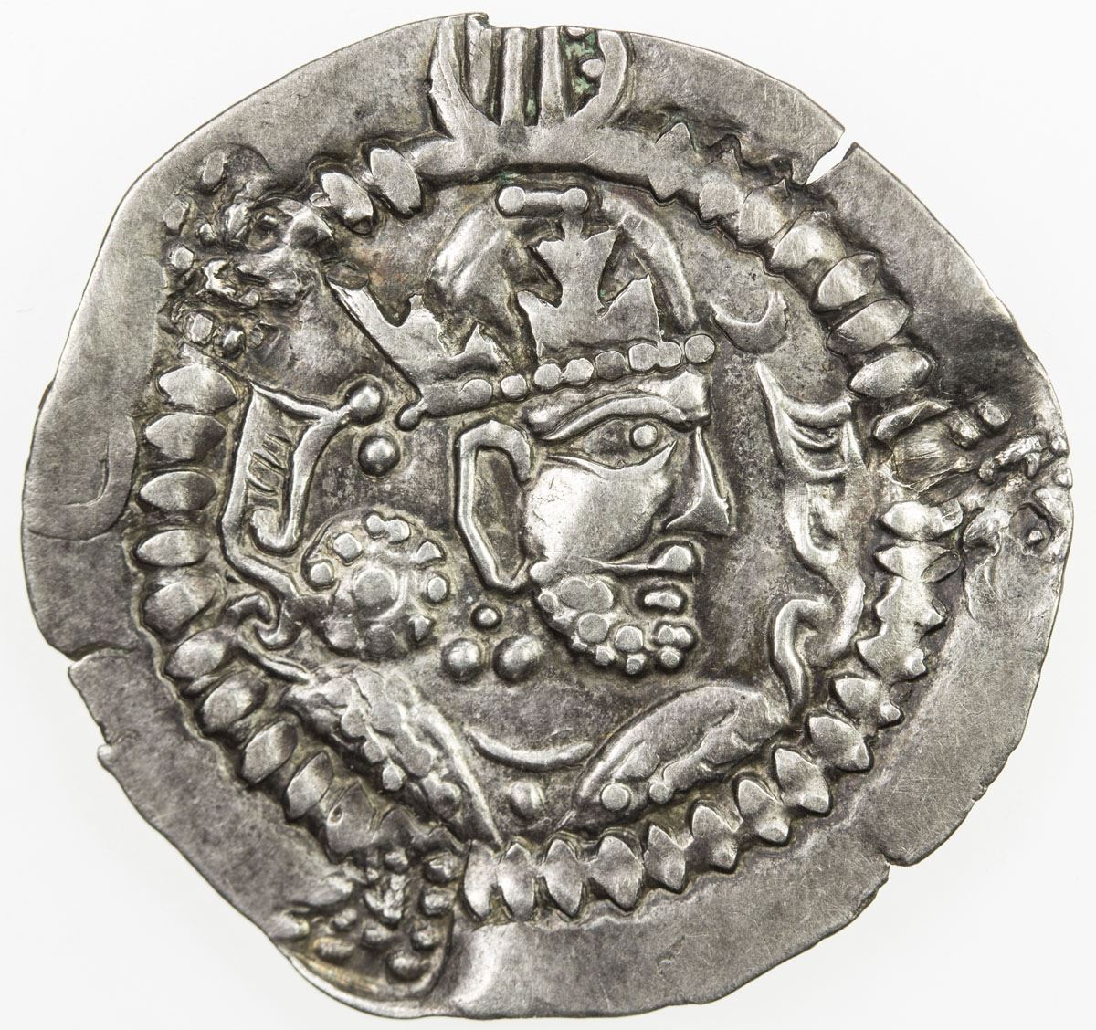 CHAGHANIAN: Anonymous, later 6th century, AR drachm (2.48g), ca. Zeno-53205, in the Northern Tokharistan region, now part of Tajikistan, derived from the standard dirham of the Sasanian Khusro I (531-579), countermark of three human heads in the obverse margin, EF.