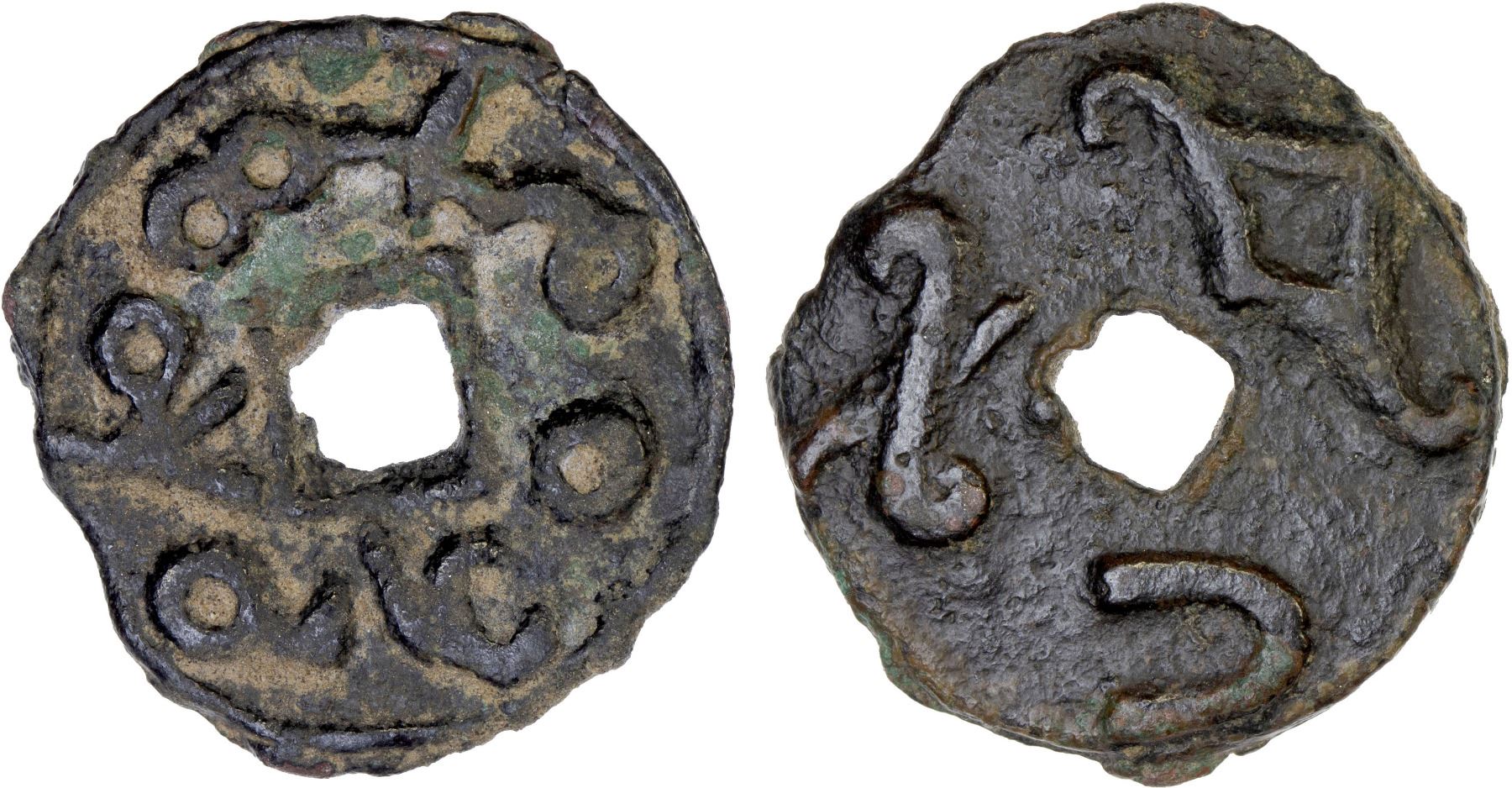 CHAGHANIYAN: Unknown ruler, probably late 8th or early 9th century, AE cash (4.89g), Zeno-355511 (this piece), Bactrian text, witih the first word read as go-adeo ("lord"), with the other word uncertain // 3 tamghas, all around the central square hole, apparently unique, XF, RRR.