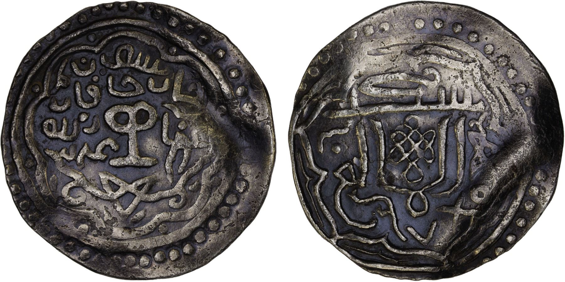 CHAGHATAYID KHANS: Yesun Timur, 1336-1340, AR dinar (6.29g), Almaligh (Xinjiang Province of China), AH740, A-1999, cf. Zeno-104777, legends yesun timur khan khaqan al-a'zam zuyyida 'adluhu // sikka almaligh 740; the obverse legend is crudely engraved, either an official die cut by an incapable engraver or a contemporary imitation; the reverse die is relatively accurately engraved; virtually no weakness, only one small crease, lovely VF, RRR.