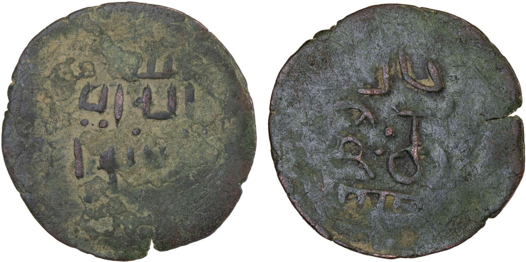 CHAGHATAYID KHANS: temp. Isan Buqa, 1309-1318, AE fals (2.27g), Dar al-Rijal Tirmidh, ND, A-1987F, mint name around the Chaghatayid tamgha // kalima in 4 lines, without marginal legends, thus undated; legends exactly the same as the centers of the Tirmidh silver dirham of type A-1987, which is dated AH710 or 71x; some weakness but above average, crude VF, RR. Clear mint name "dar al-rijal tirmidh".