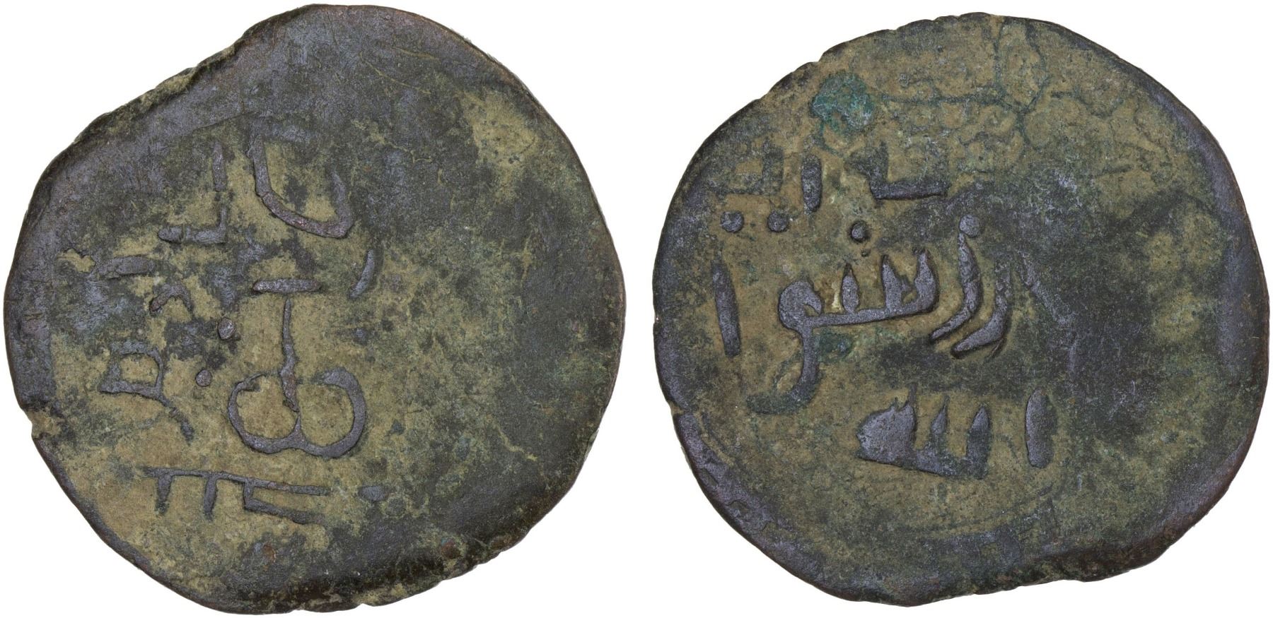 CHAGHATAYID KHANS: temp. Isan Buqa, 1309-1318, AE fals (3.11g), Dar al-Rijal Tirmidh, ND, A-1987F, mint name around the Chaghatayid tamgha // kalima in 4 lines, without marginal legends, thus undated; legends exactly the same as the centers of the Tirmidh silver dirham of type A-1987, which is dated AH710 or 71x, some weakness, crude VF, RR. Clear mint name "(dar) al-rijal tirmidh".