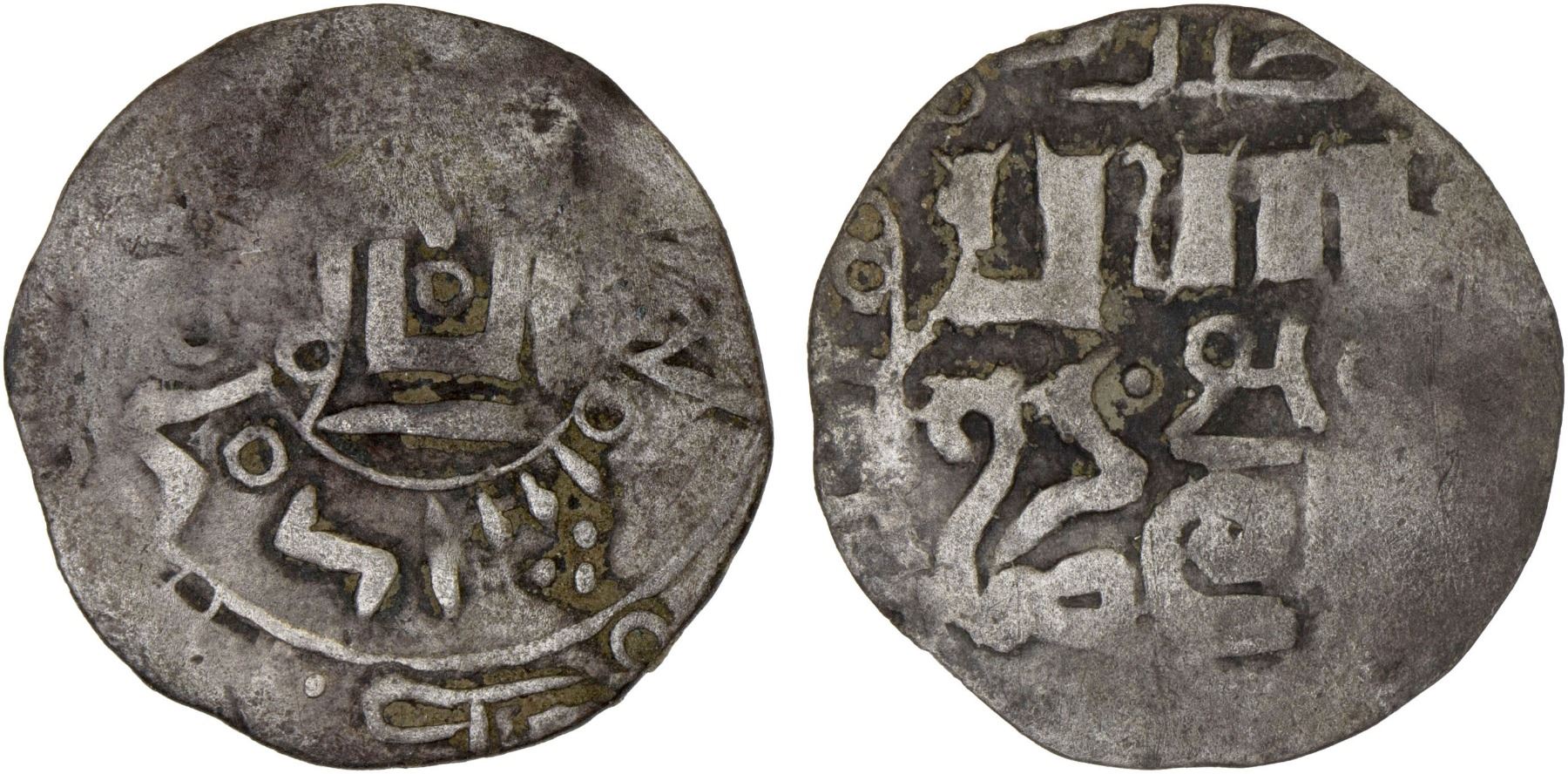 CHAGHATAYID KHANS: temp. Qaidu, 1270-1302, AR dirham (1.05g), "Almaligh", ND, A-C1986, cf. Zeno-244330 (for a discussion about this type), actually struck at Tarsakent (now Bishkek in Kyrgyzstan); with tamgha of Qaidu above almaligh on the obverse (off flan on this piece), Tibetan character MAM in the reverse center, about 20% flat strike, Fine, RR.