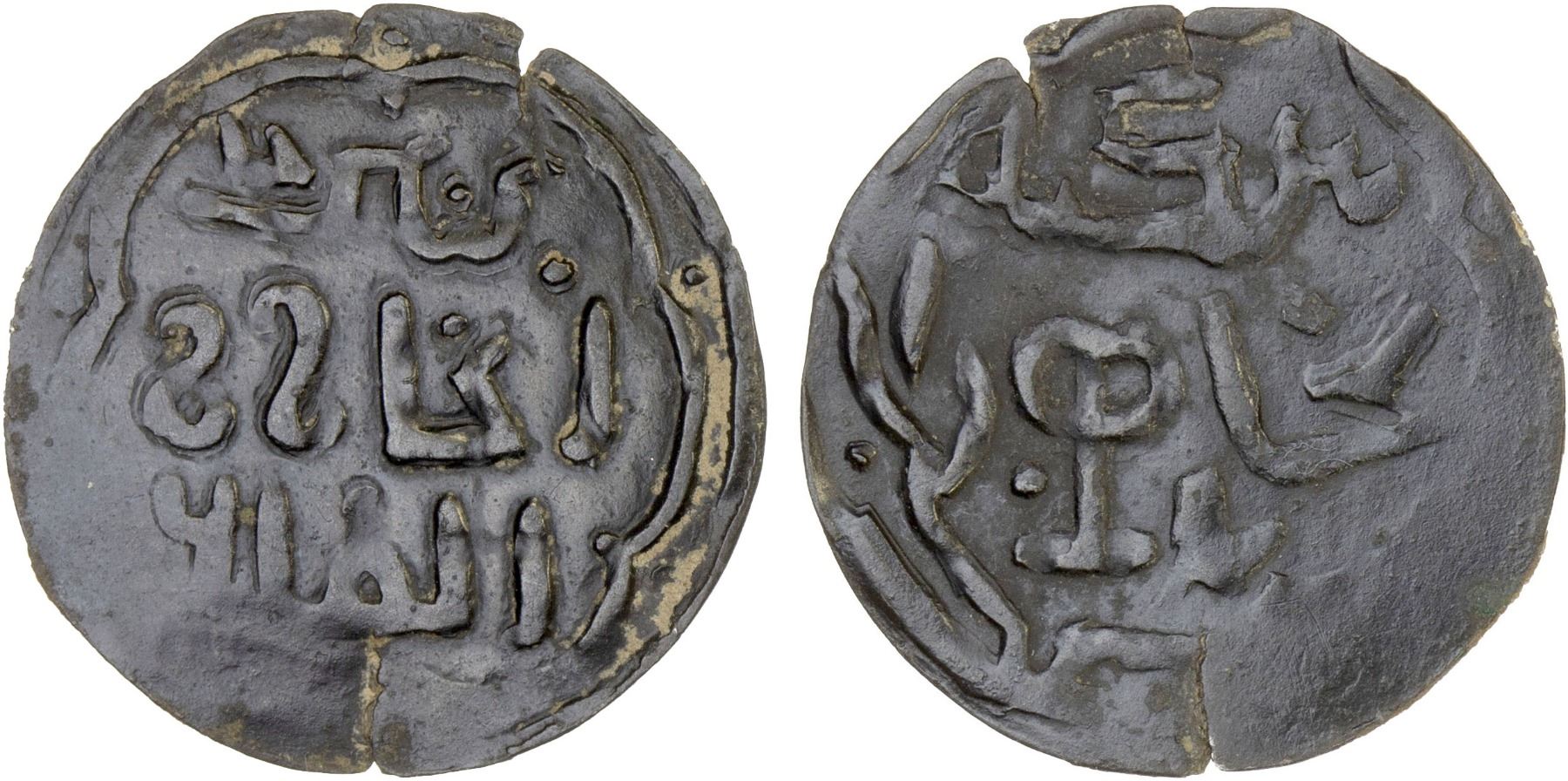 CHAGHATAYID KHANS: temp Ali Sultan, 1340, AE light fals (0.63g), Bukhara, ND, A-2007L-var, clear mint with the Chaghatayid tamgha between the first 3 and last 2 letters of the mint name; with the symbols resembling S S, so far known only on the silver dirhams of Ali Sultan dated AH741 (type A-2007L), likely a contemporary forgery VF, RRR