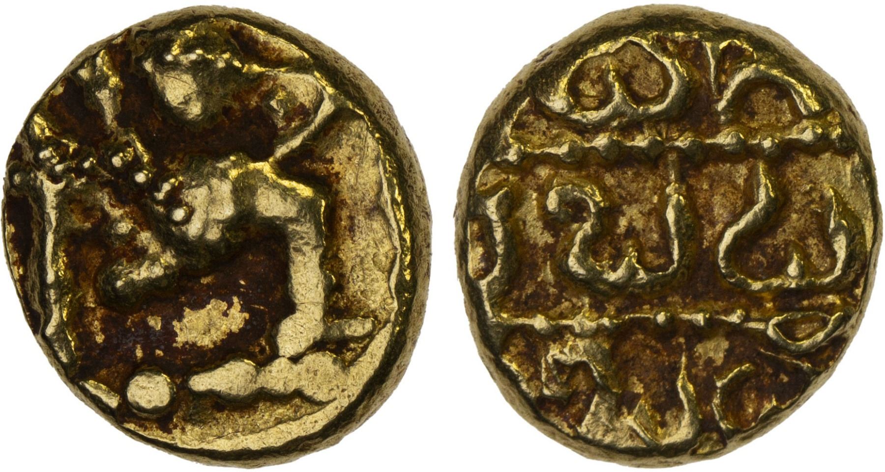 CHALUKYAS OF KALYANA: Somesvara, ca. 1181-1189, AV pagoda (3.54g), Mitch-283/85, Chattopadhyaya-118/20, Garuda running to the right // Kannada legend, XF.
