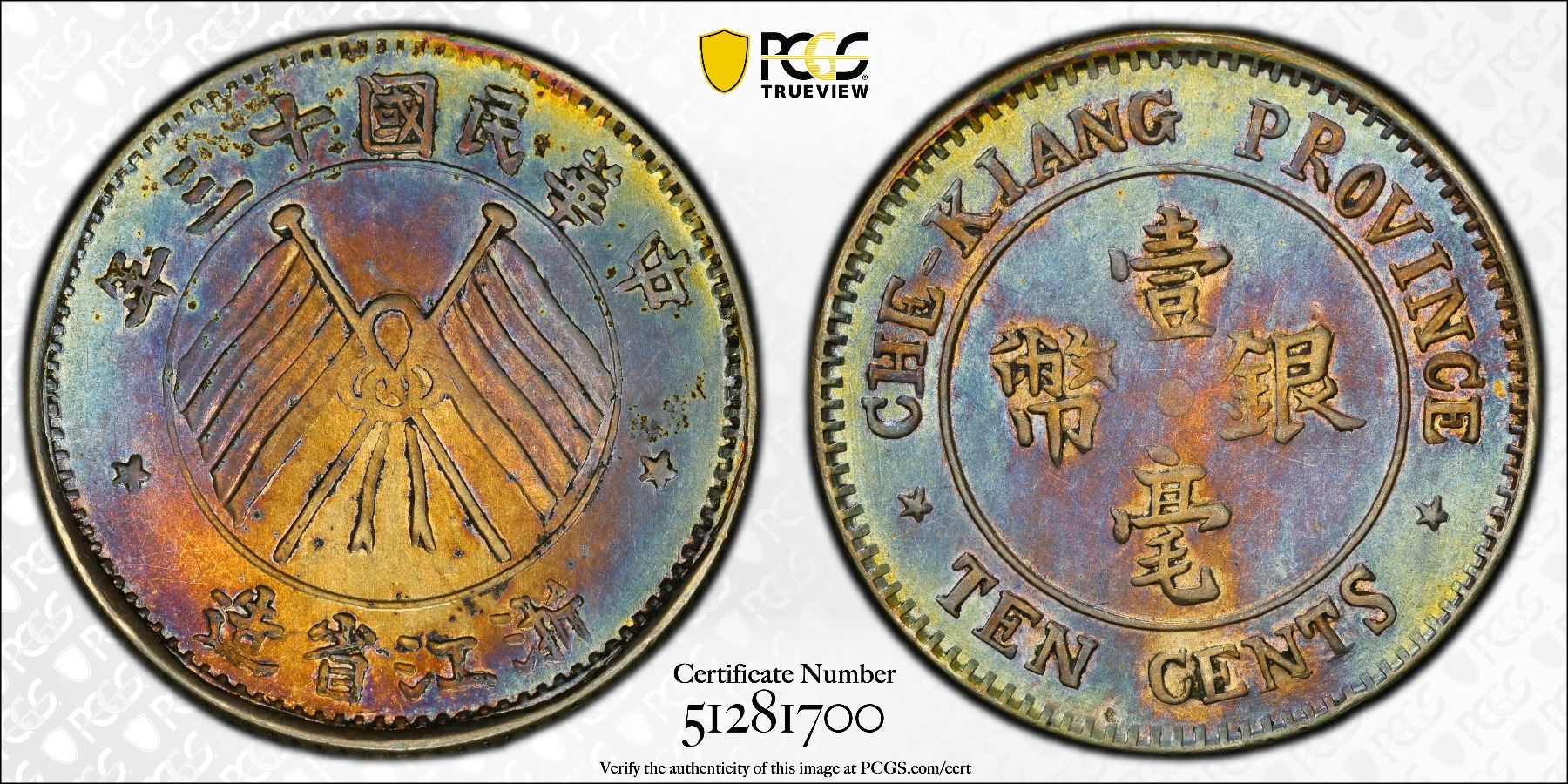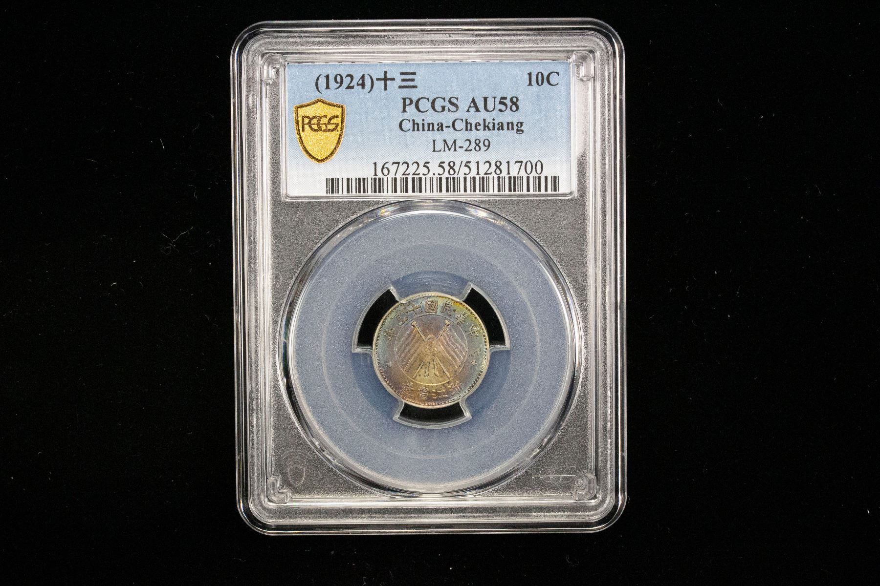 CHEKIANG: Republic, AR 10 cents, year 13 (1924), Y-371, L&M-289, crossed Five-colored flags, an attractive toned nearly mint state example, PCGS graded AU58.