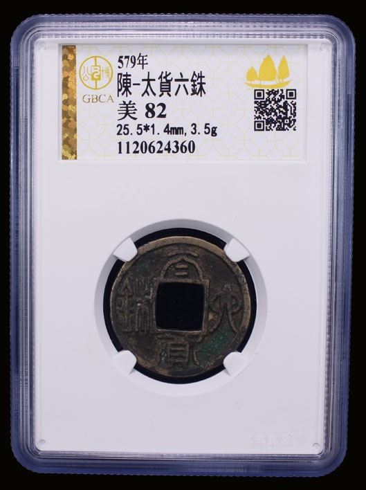CHEN: Anonymous, 557-589, AE cash (3.5g), H-13.18, tai huo liu zhu ("large coin six zhu"), issued by Emperor Xuan of Chen in 579 AD, graded 82 by GBCA Grading Company, VF-XF. This coin with the beautiful calligraphy, displayed at the left, is considered to be the "crown jewel " of Southern Dynasty coins. The coin was originally worth ten regular wu zhu coins, but because of popular discontent was revalued to one wu zhu.