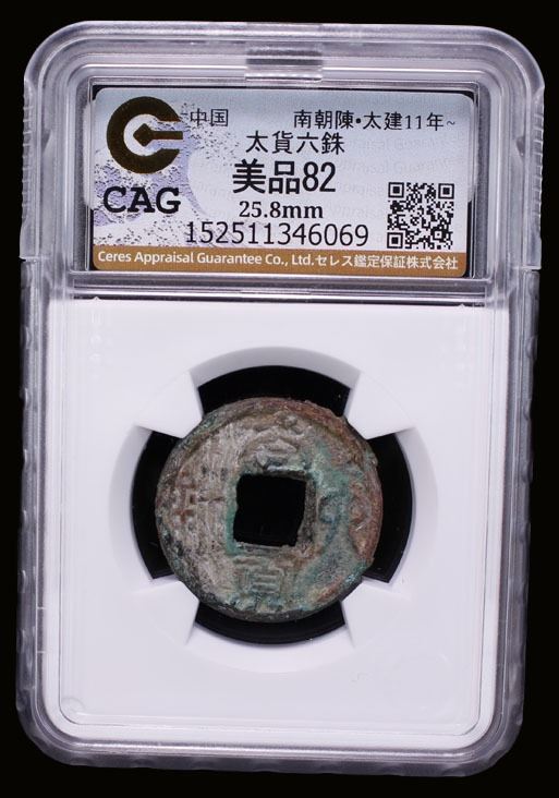 CHEN: Anonymous, 557-589, AE cash, H-13.18, tai huo liu zhu ("large coin six zhu") in archaic script, graded 82 by CAG Grading Company, VF. Issued by Emperor Xuan (Shaoshi) of Chen in 579 AD, this coin is considered the crown jewel of Southern Dynasty coins thanks to its beautiful calligraphy. It was originally worth ten regular wu zhu coins but later revalued to one wu zhu due to popular discontent.