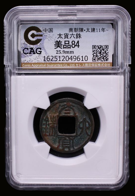 CHEN: Anonymous, 557-589, AE cash, H-13.18, tai huo liu zhu ("large coin six zhu"), issued by Emperor Xuan of Chen in 579 AD, graded 84 by CAG Grading Company, VF. This coin with the beautiful calligraphy, displayed at the left, is considered to be the "crown jewel" of Southern Dynasty coins. The coin was originally worth ten regular wu zhu coins, but because of popular discontent was revalued to one wu zhu.