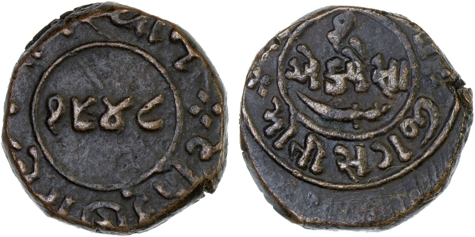 CHHOTA UDAIPUR: Motisinghji, 1881-1905, AE paisa (7.06g), VS1948 (1891), Y-4, date within circle // denomination and scimitar within circle, accompanied by collector's information card, VF-XF, ex Anton Holt Collection.