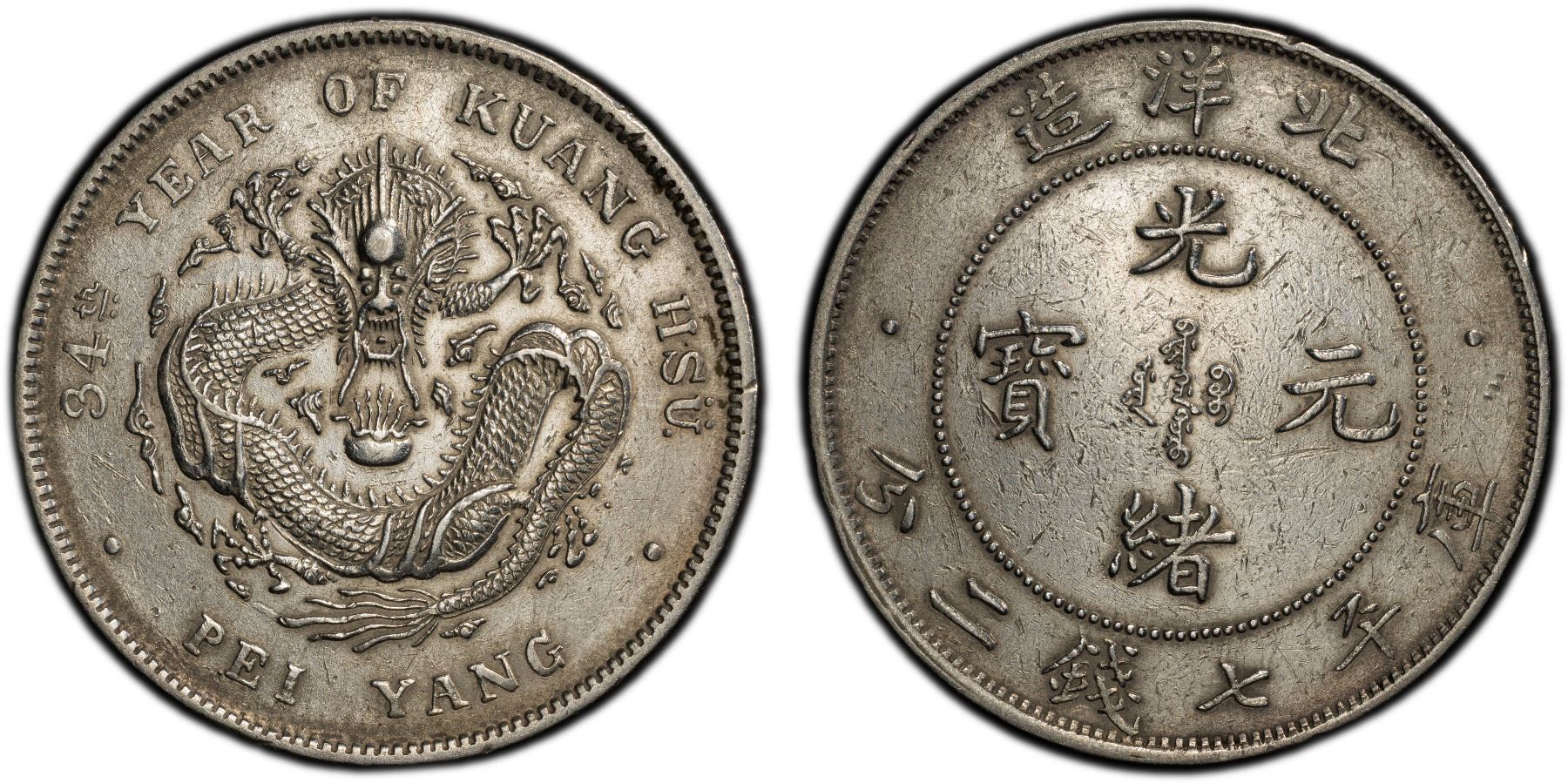 CHIHLI: Kuang Hsu, 1875-1908, AR dollar, Peiyang Arsenal Mint, Tientsin, year 34 (1908), Y-73.2, L&M-465A, short spine variety, cleaned, PCGS graded XF details.