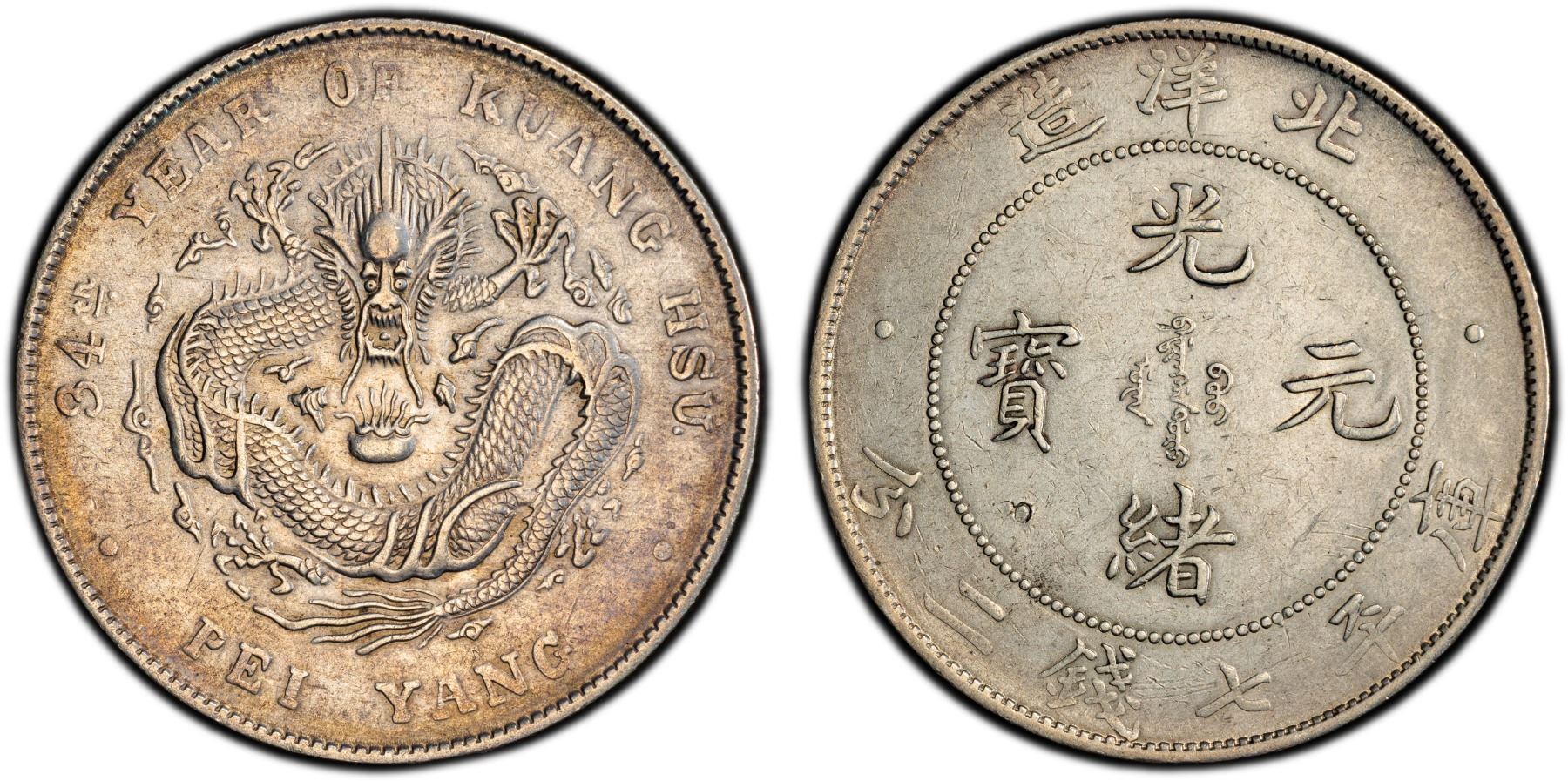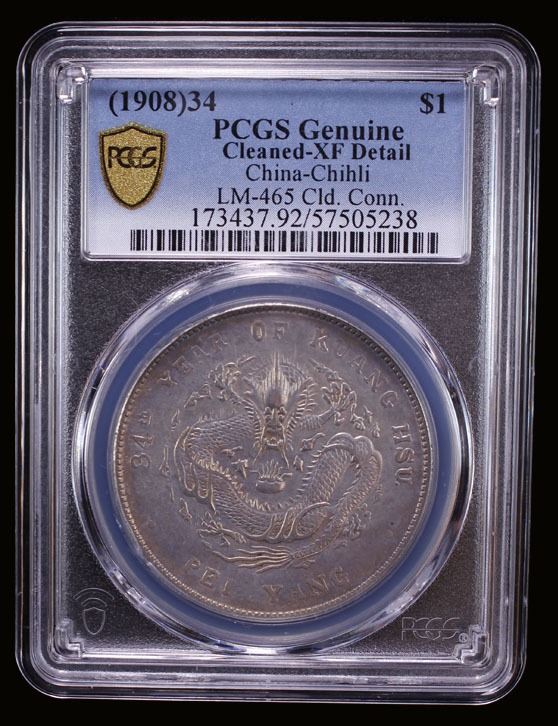 CHIHLI: Kuang Hsu, 1875-1908, AR dollar, Peiyang Arsenal Mint, Tientsin, year 34 (1908), Y-73.2, L&M-465, cloud connected variety, lightly cleaned, light gray toning with golden fringes, PCGS graded XF details.
