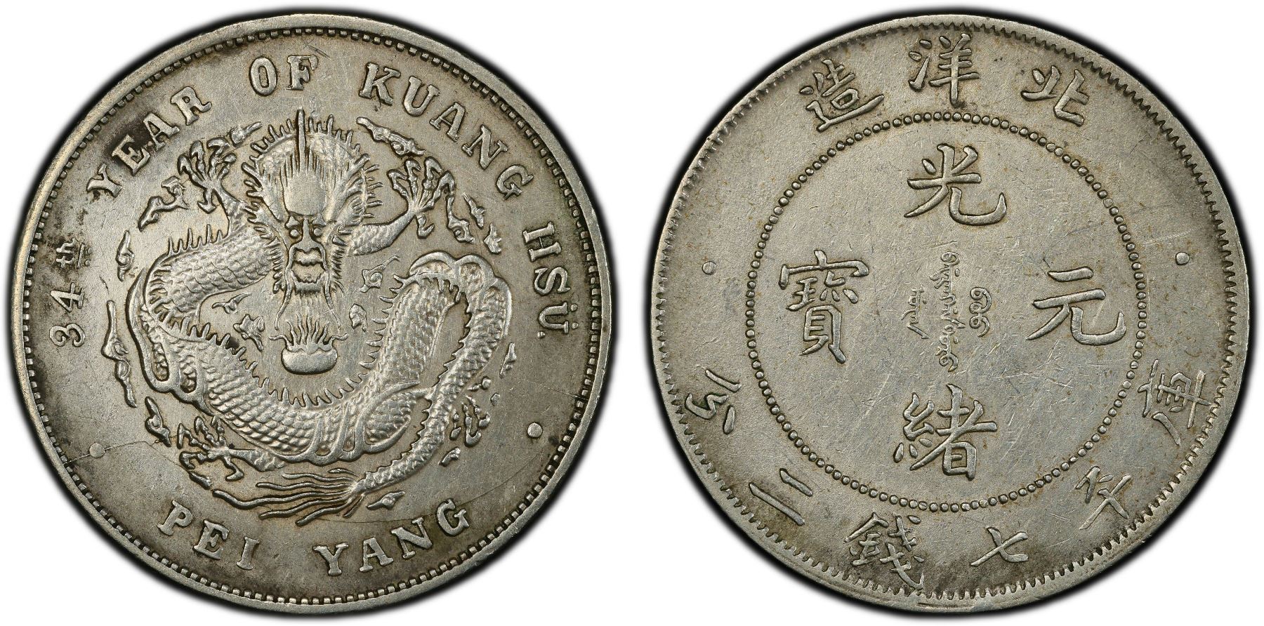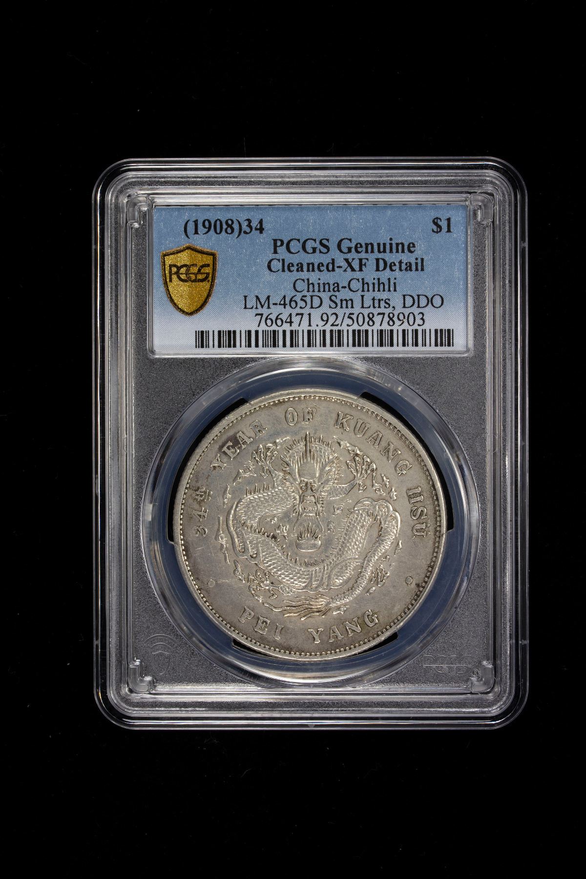 CHIHLI: Kuang Hsu, 1875-1908, AR dollar, year 34 (1908), Y-73.2, L&M-465, Peiyang Arsenal Mint, Tientsin, frozen date issue with plain 4 variety with small letters and doubled die obverse (DDO), cleaned, PCGS graded XF details, ex Dr. Dirk Löer Collection.