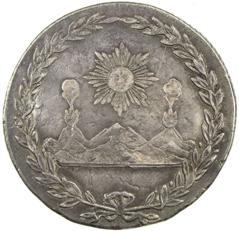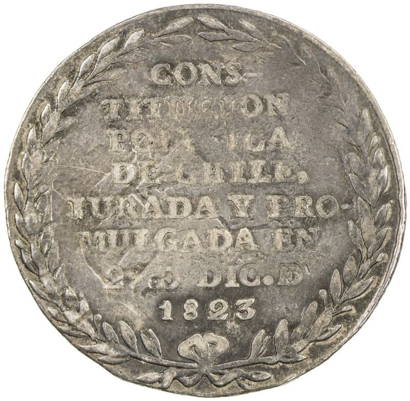 CHILE: AR proclamation 2 reales (6.58g), 1823, Medina-281, Fonrobert-9848, 28mm medallic 2 reales celebrating the invocation of the Constitution, sunface over mountains with flanking two volcanos with laurel wreath around all / CONS- TITUCION POLITICA DE CHILE, JURADA U PRO- MULGADA EN 29 D DIC.D 1823 in eight lines within laurel wreath, struck over Spanish Colonial portrait 2 reales, somewhat dished from overstrike, engrailed edge, steel-gray tone, VF.