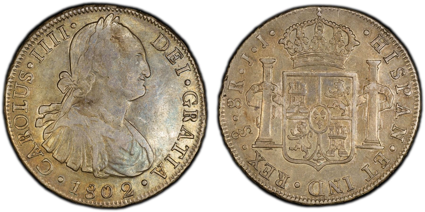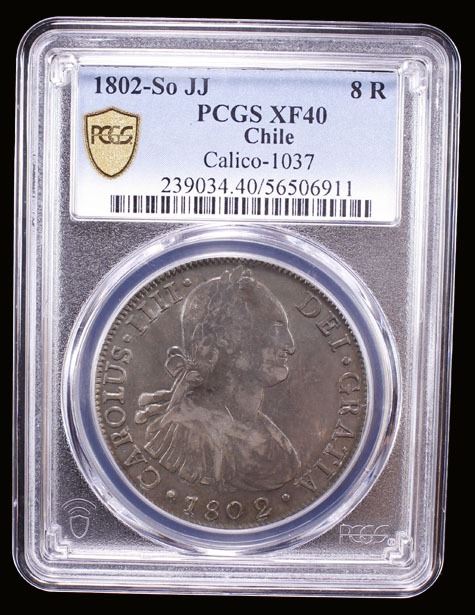 CHILE: Carlos IV, 1788-1808, AR 8 reales, Santiago, 1802-So, KM-51, Calicó-1037, assayer JJ, deeply toned, PCGS graded EF40.