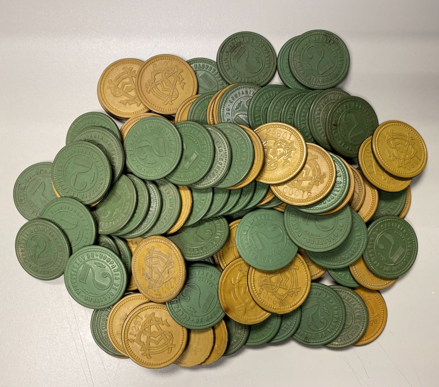 CHILE: LOT of 100 tokens, all vulcanite mining tokens from Compañia de Salitres de Antofagasta, Antofagasta, Antofagasta Province, all are ND (1904-5) 2 pesos vulcanite tokens Rulau-Ant 26 (100 pcs, green-black-tan); grades generally from VF-EF, all with individual control numbers, a minority are scyphate with the monogram side dished out, in plastic bag, viewing recommended; retail value $1500, lot of 100 pieces.
