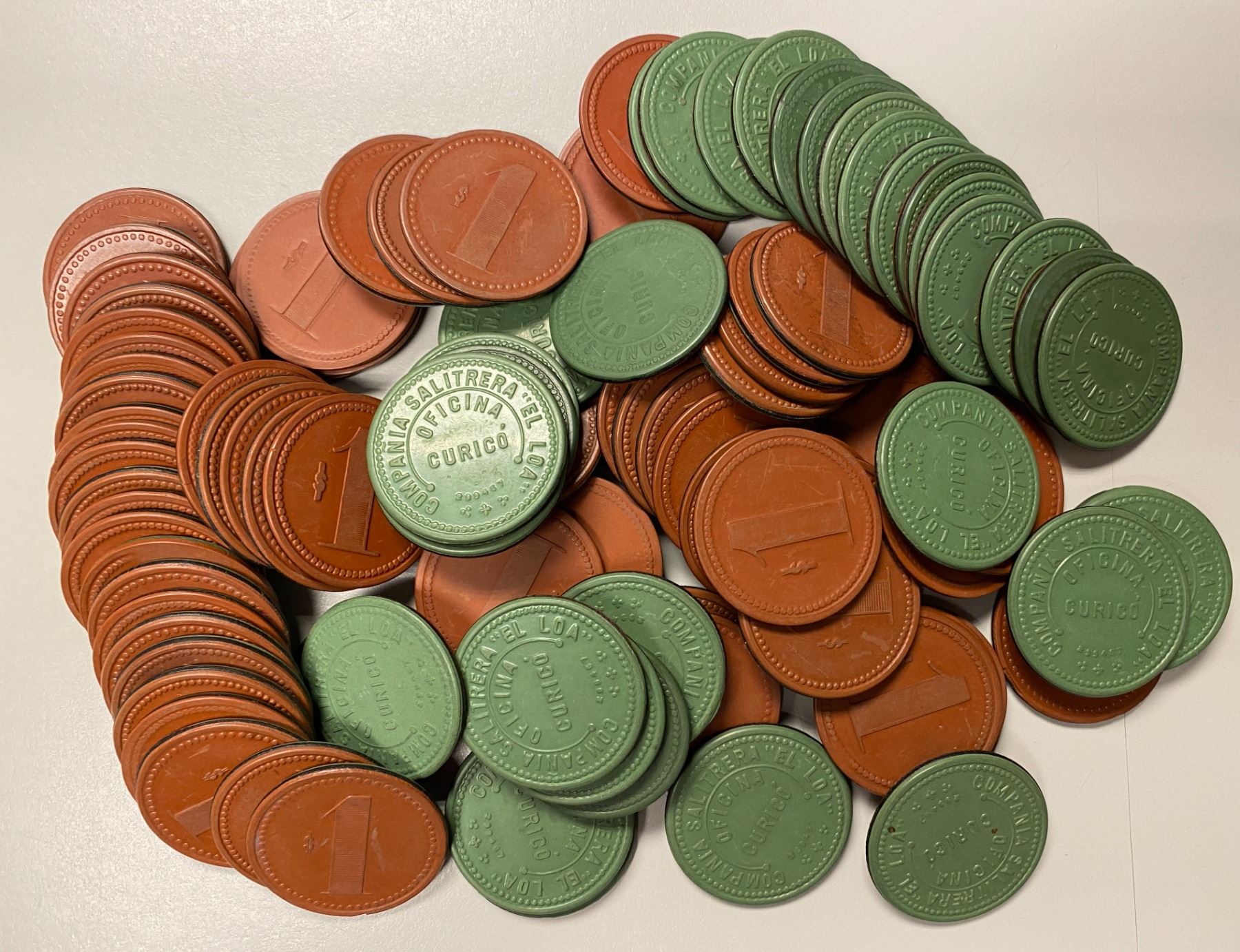 CHILE: LOT of 101 tokens, all vulcanite mining tokens from Compañia Salitrera "El Loa", Officina Curico, Sierra Gorda, Antogagasta Province, all are ND (1906-7) 1 peso vulcanite tokens Rulau-Ant 157 (101 pcs, green-black-red); grades from Good-EF (most VF-EF), at least three sub-varieties present, in plastic bag, viewing recommended; retail value $600, lot of 101 pieces.