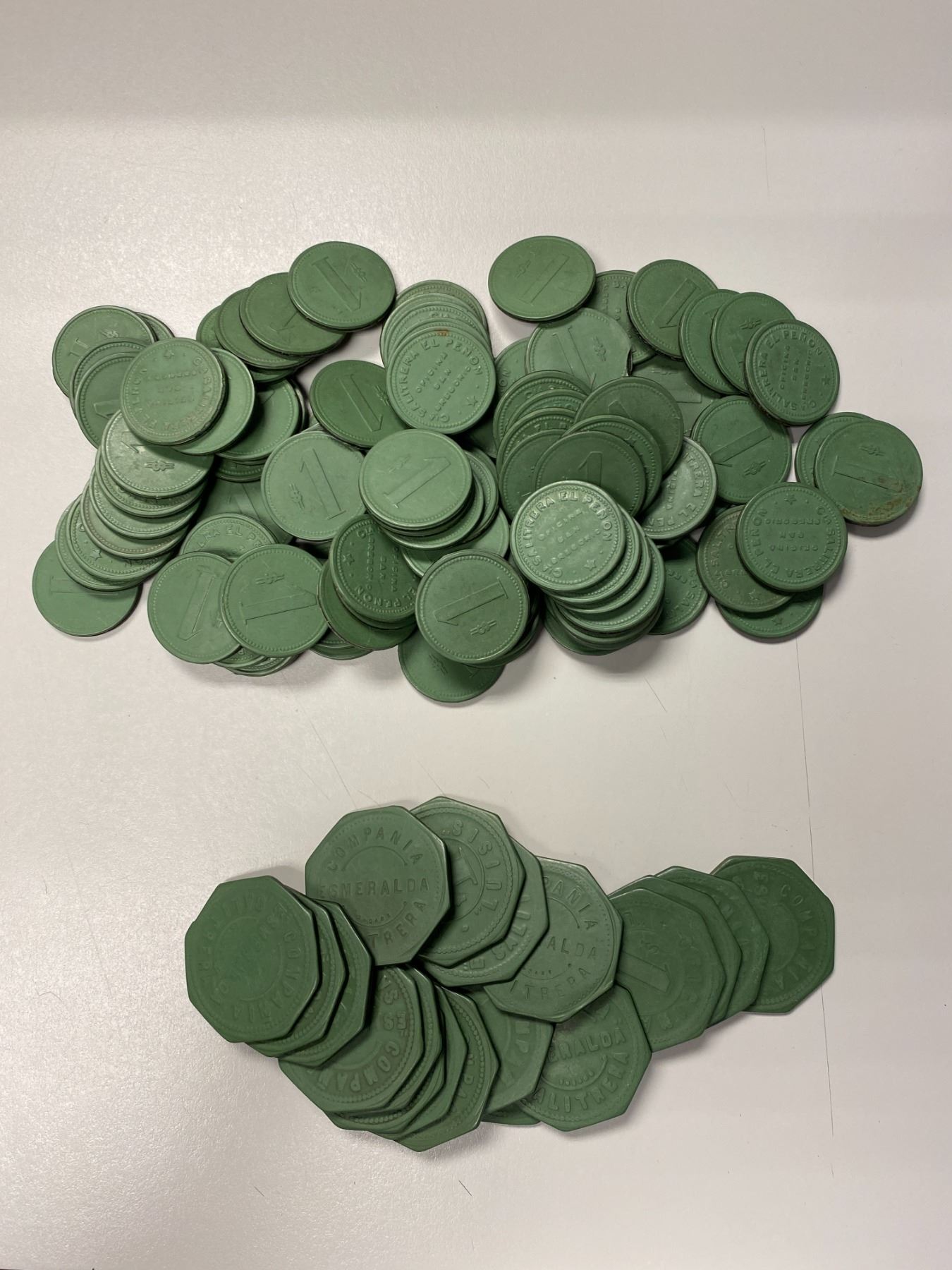 CHILE: LOT of 109 tokens, all vulcanite mining tokens, including from Compañia Salitrera "Esmeralda", Officina Luisis, Tocopilla, Antofagasta Province, all are ND 1 peso vulcanite tokens Rulau-Ant 161 (19 pcs, green-black-green); and Cia. Salitrera el Peñon, Officina San Gregorio, Aguas Blancas, Antofagasta Province, all are ND 1 peso vulcanite tokens Rulau-Ant 8 (90 pcs, green-black-green); grades generally from G-VF for the Esmeralda and F-VF for the Peñon, at least two sub-varieties present for the Esmeralda, in plastic bags, viewing recommended; retail value $975, lot of 109 pieces.