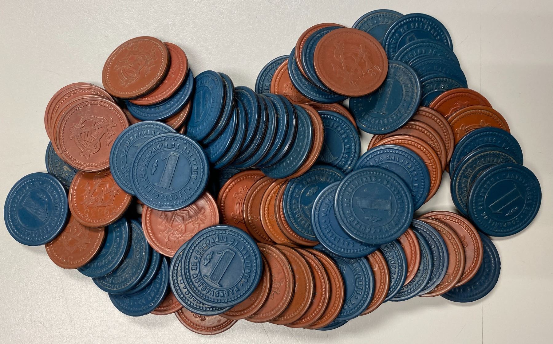 CHILE: LOT of 87 tokens, all vulcanite mining tokens from Compañia de Salitres de Antofagasta, Antofagasta, Antofagasta Province, all are ND (ca. 1904) 1 peso vulcanite tokens Rulau-Ant 28 (87 pcs, deep blue-black-red); grades generally from VF-EF, all with individual control numbers, a a few are convex and less well struck, in plastic bag, viewing recommended; retail value $1050, lot of 87 pieces.