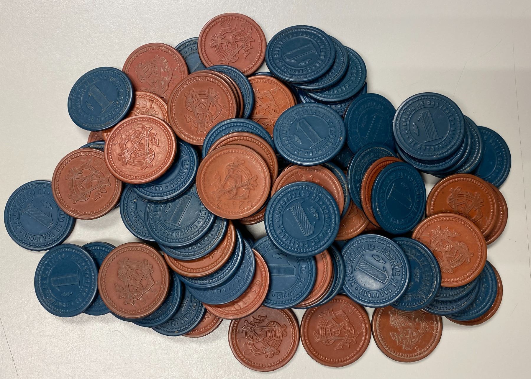 CHILE: LOT of 88 tokens, all vulcanite mining tokens from Compañia de Salitres de Antofagasta, Antofagasta, Antofagasta Province, all are ND (ca. 1904) 1 peso vulcanite tokens Rulau-Ant 28 (88 pcs, deep blue-black-red); grades generally from VF-EF, all with individual control numbers, a a few are convex and less well struck, in plastic bag, viewing recommended; retail value $1050, lot of 88 pieces.
