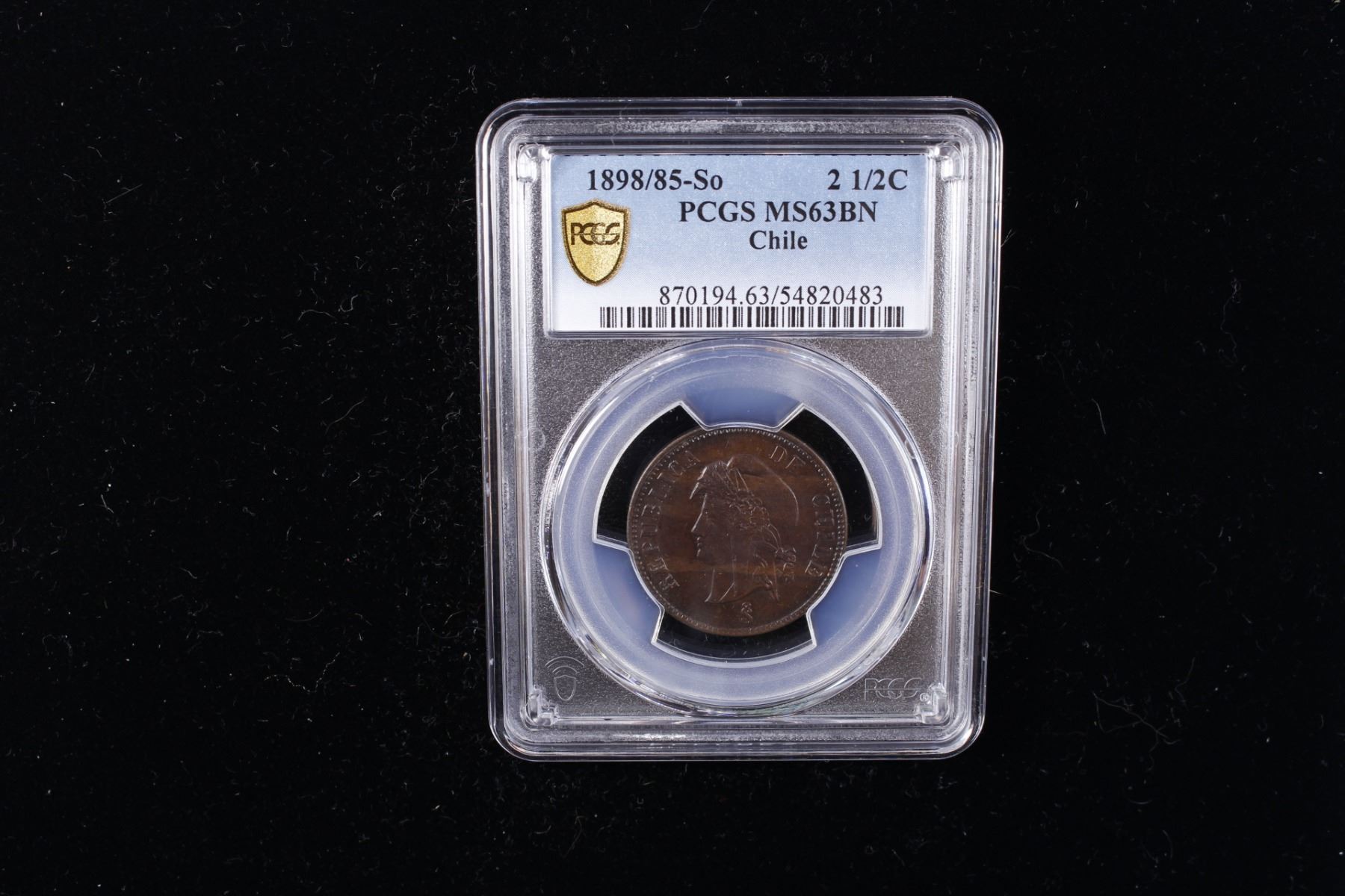 CHILE: Republic, AE 2½ centavos, 1898/85-So, KM-150, a lovely example and a scarce overdate, PCGS graded MS63 BN. The single highest graded example (Top Pop) at PCGS!