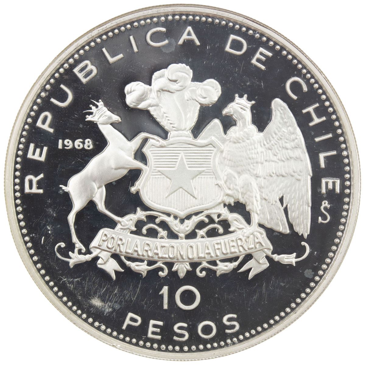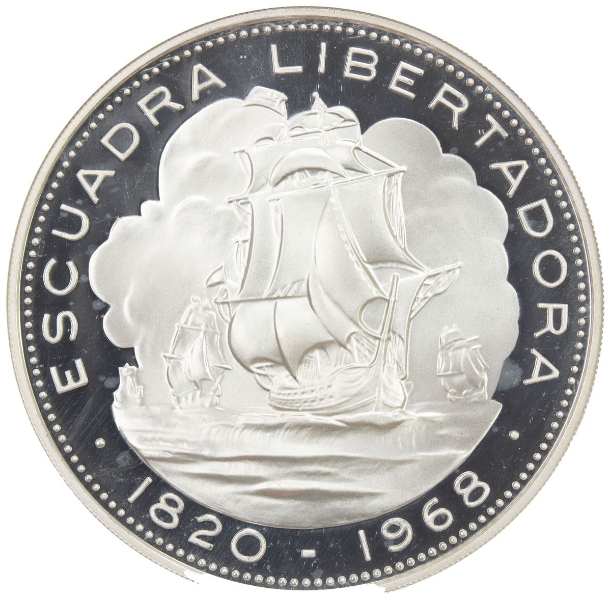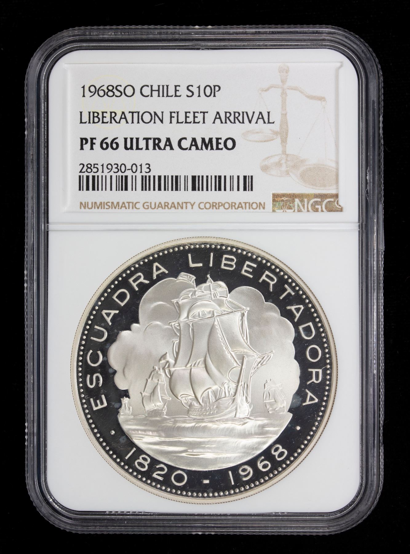 CHILE: Republic, AR 10 pesos, 1968-So, KM-183, Arrival of the Liberation Fleet of 1820 under the Command of Lord Cochrane, NGC graded PF66 UC.