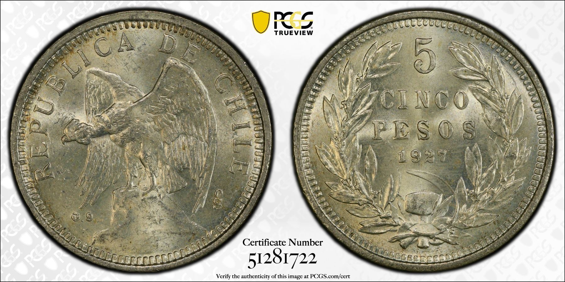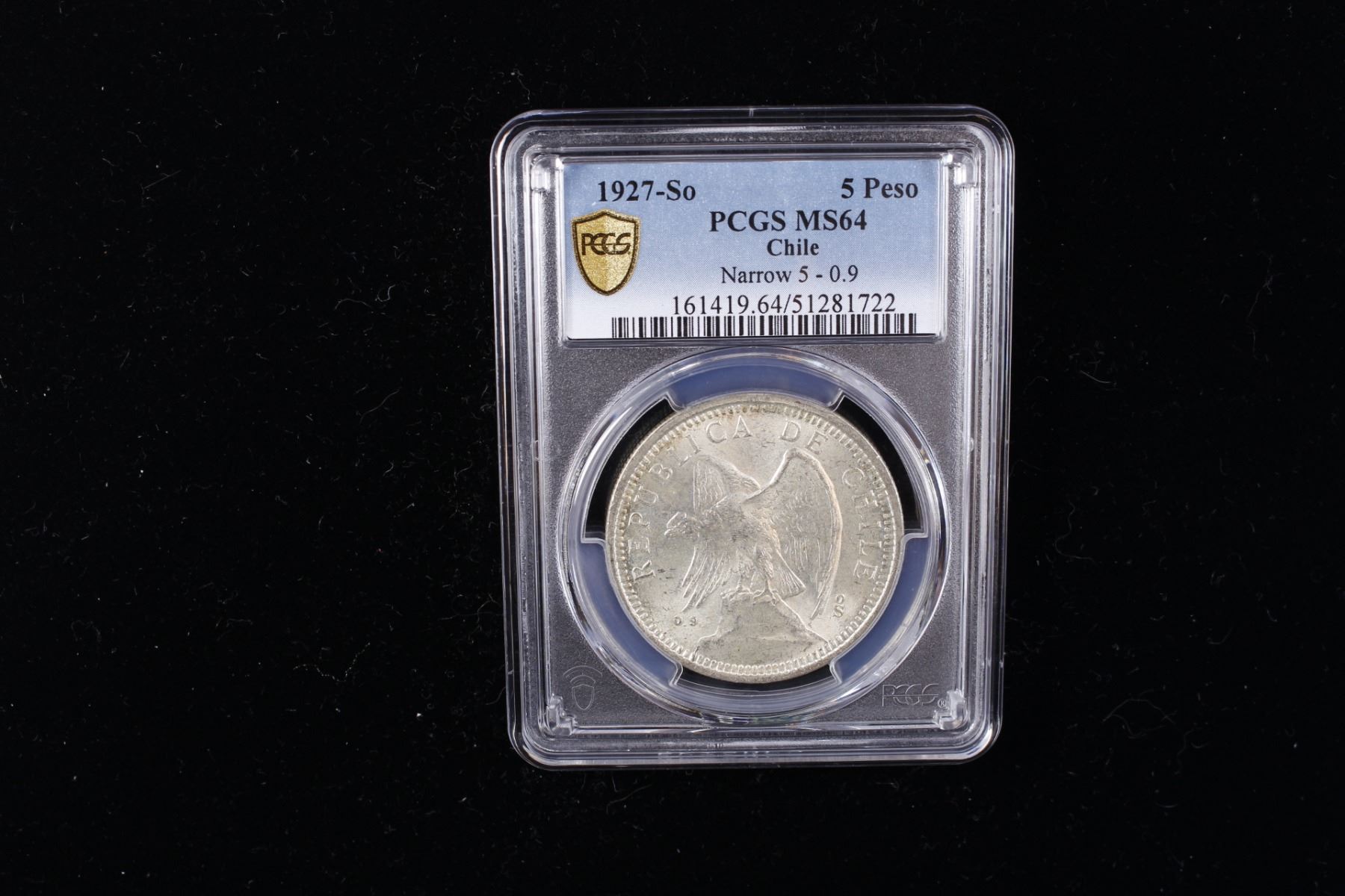 CHILE: Republic, AR 5 pesos, 1927-So, KM-173.2, narrow 5 variety, a wonderful lustrous example! PCGS graded MS64.