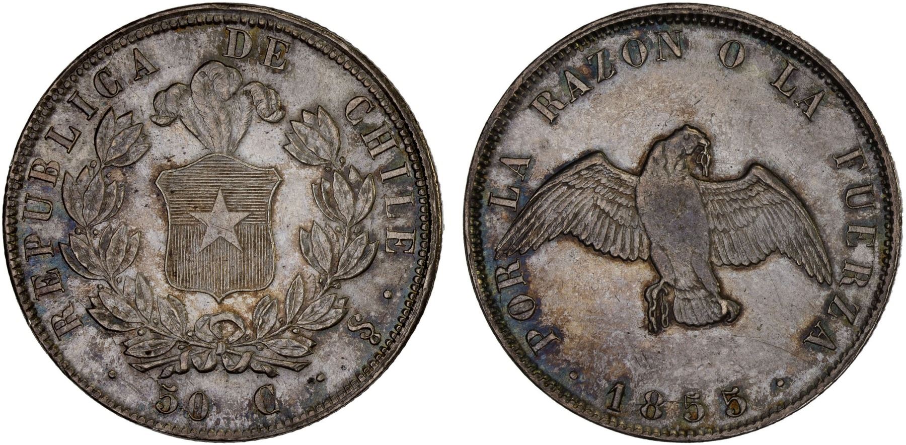 CHILE: Republic, AR 50 centavos, 1855-So, KM-128, condor with spread wings, hairlines, AU.