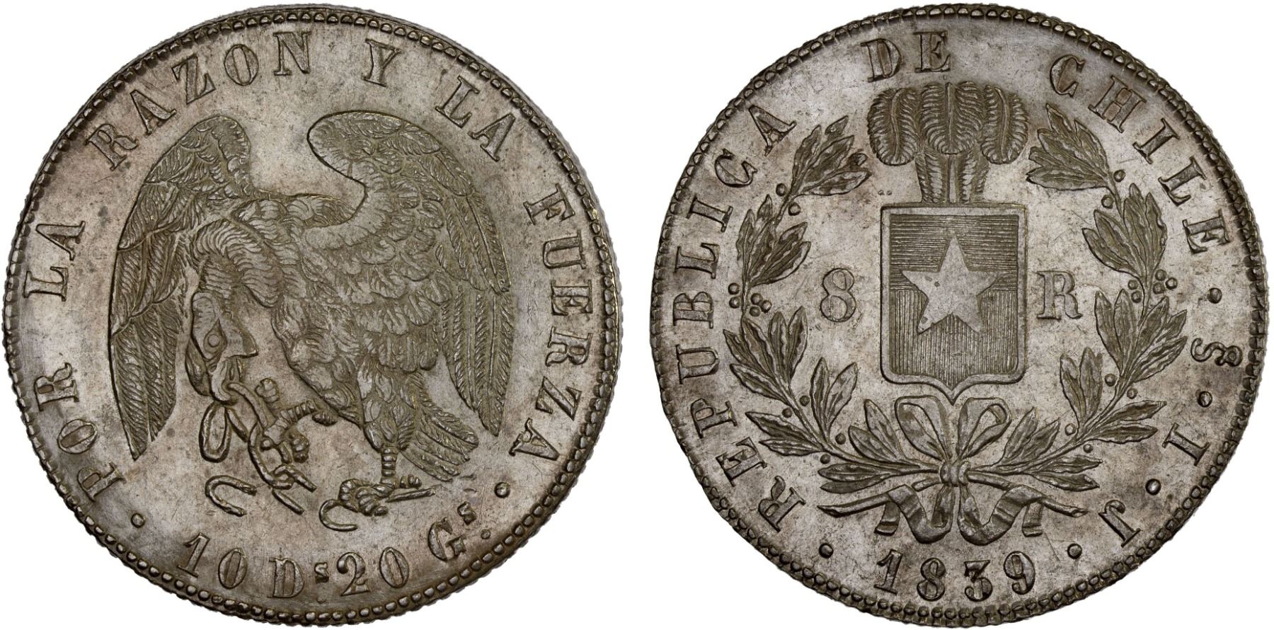 CHILE: Republic, AR 8 reales, 1839-So, Choice AU