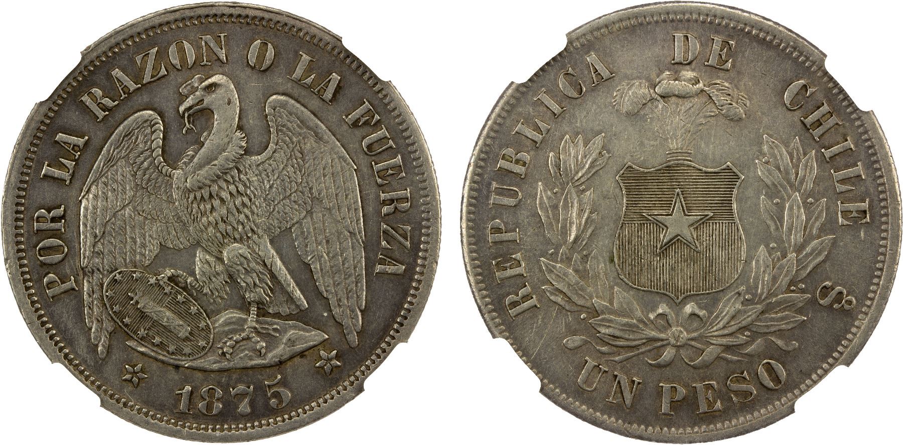 CHILE: Republic, AR peso, 1875-So, NGC AU details