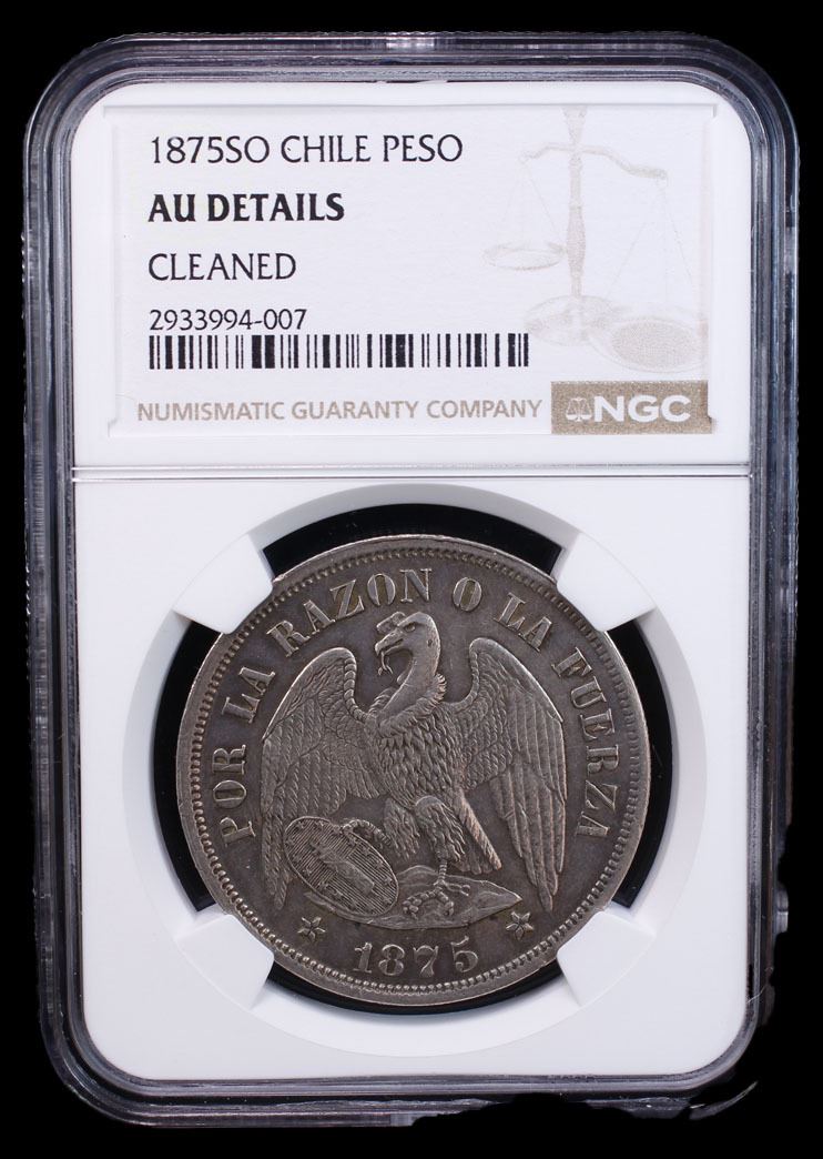 CHILE: Republic, AR peso, 1875-So, KM-142.1, lightly cleaned, starting to retone, NGC graded AU details.
