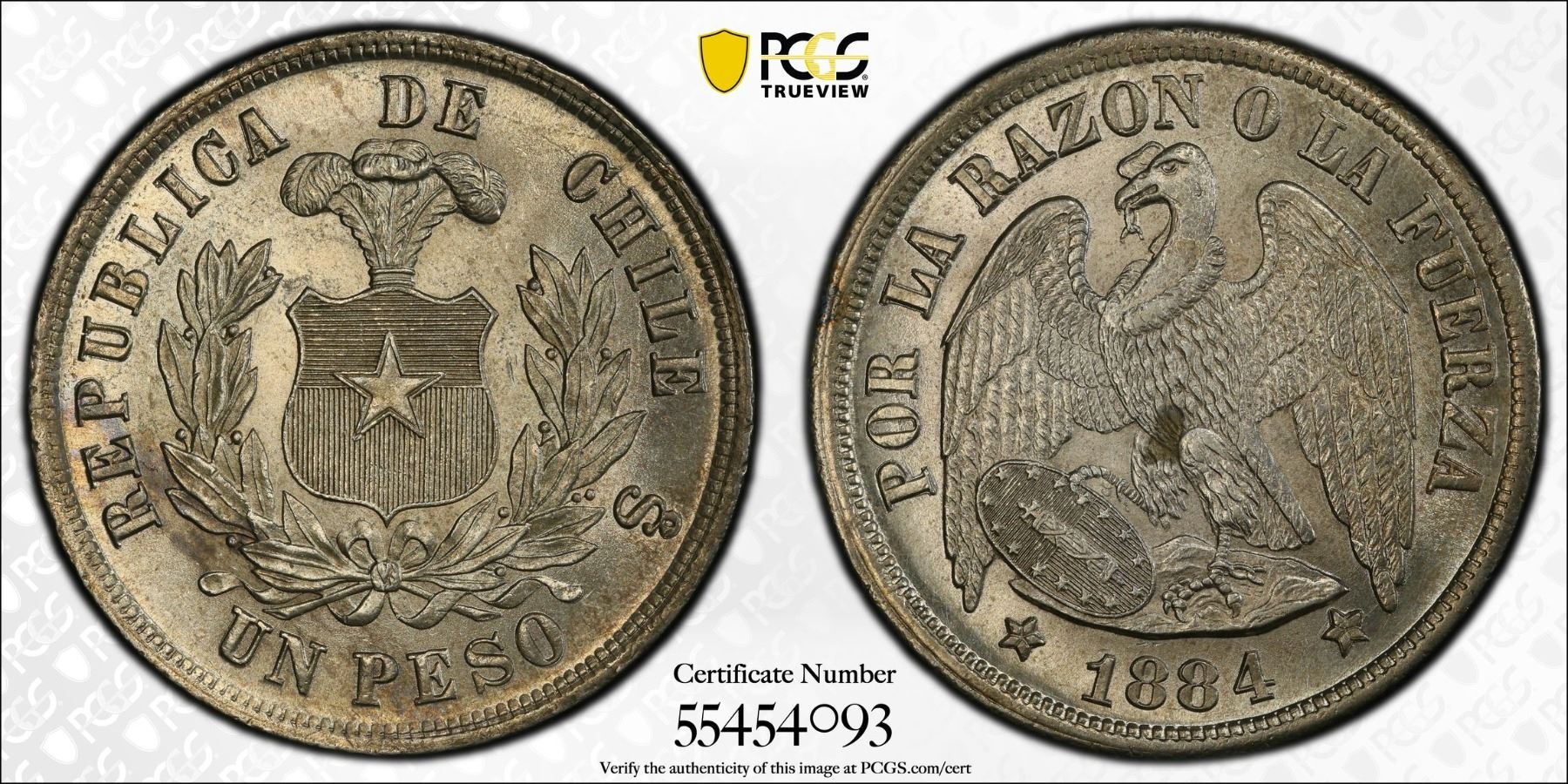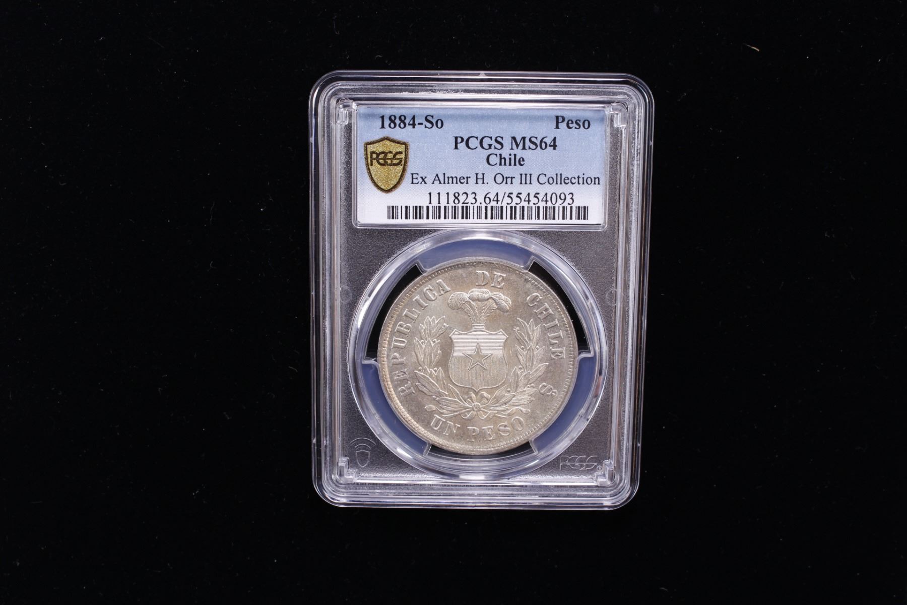 CHILE: Republic, AR peso, 1884-So, KM-142.1, lustrous, PCGS graded MS64, ex Almer H. Orr III Collection.