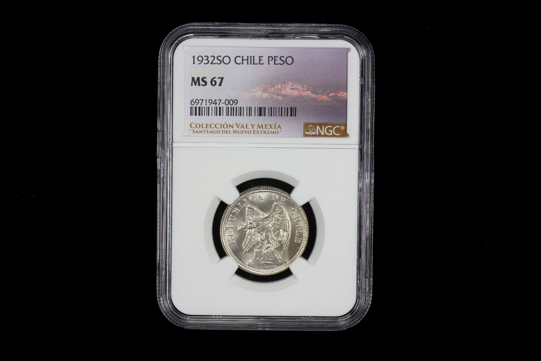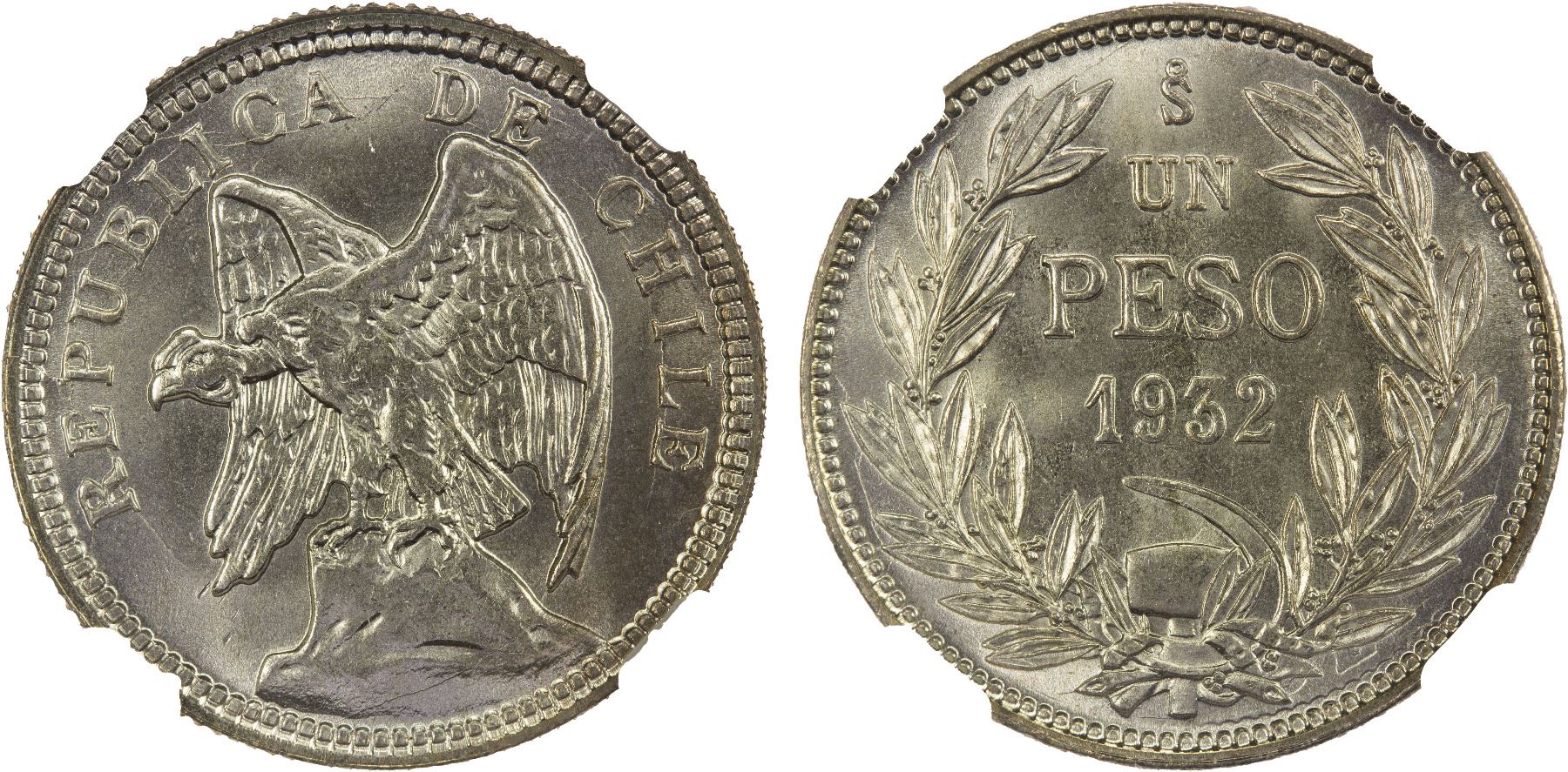 CHILE: Republic, AR peso, 1932-So, KM-174, one-year type, a stunning lustrous example! NGC graded MS67. Graded 'top pop' at NGC for finest known example!