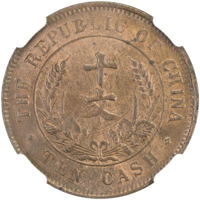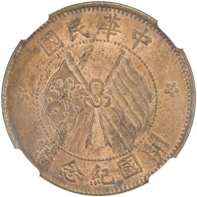 CHINA: AE 10 cash, ND (1920), Y-303, crossed Wuchang Uprising and five-colored flags, NGC graded MS64 RB.