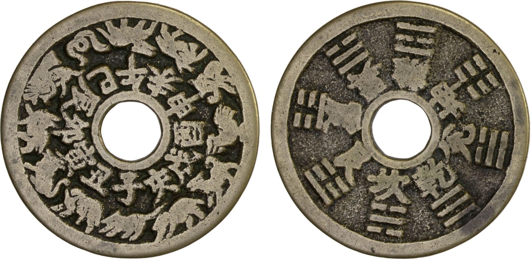 CHINA: AE charm (12.33g), CCC-1773, 37mm, twelve animals of the Chinese Zodiac, zi chou yin mao chen si wu wei shen you xu hai around // eight trigrams, qian kan gen zhen xun li kun dui around, likely cast in the late Qing Dynasty, Fine. The Chinese zodiac is a classification scheme based on the lunar calendar that assigns an animal and its reputed attributes to each year in a repeating 12-year cycle. The 12-year cycle is an approximation to the 11.85-year orbital period of Jupiter. Originating from China, the zodiac and its variations remain popular in many East Asian and Southeast Asian countries, such as Japan, South Korea, Vietnam, Cambodia, and Thailand.