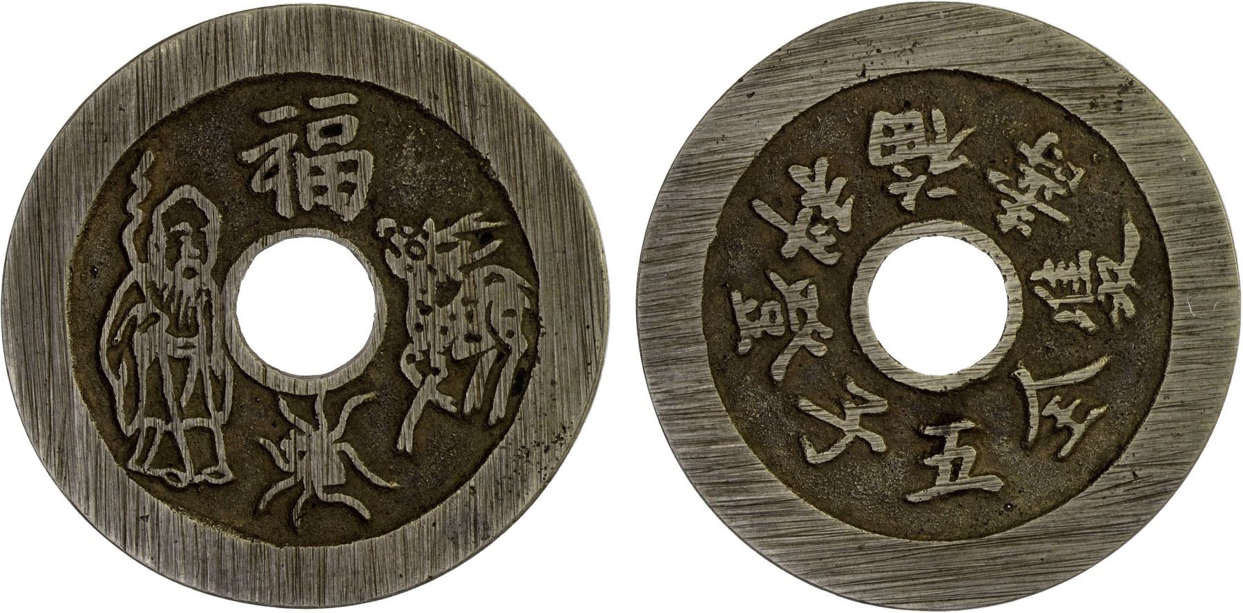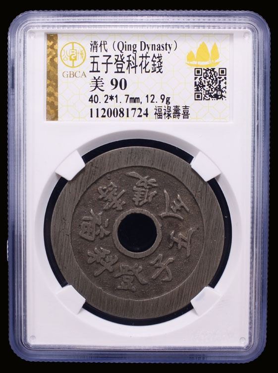 CHINA: AE charm (12.9g), CCC-823, 30mm, character fu at top, deer and old man at sides, spider below // wu zi deng ke fú shòu shuang quán (May your five sons achieve great success in the imperial examinations - Happiness and longevity both complete), graded 90 by GBCA Grading Company, a fantastic example! XF. Likely cast in the Qing dynasty.