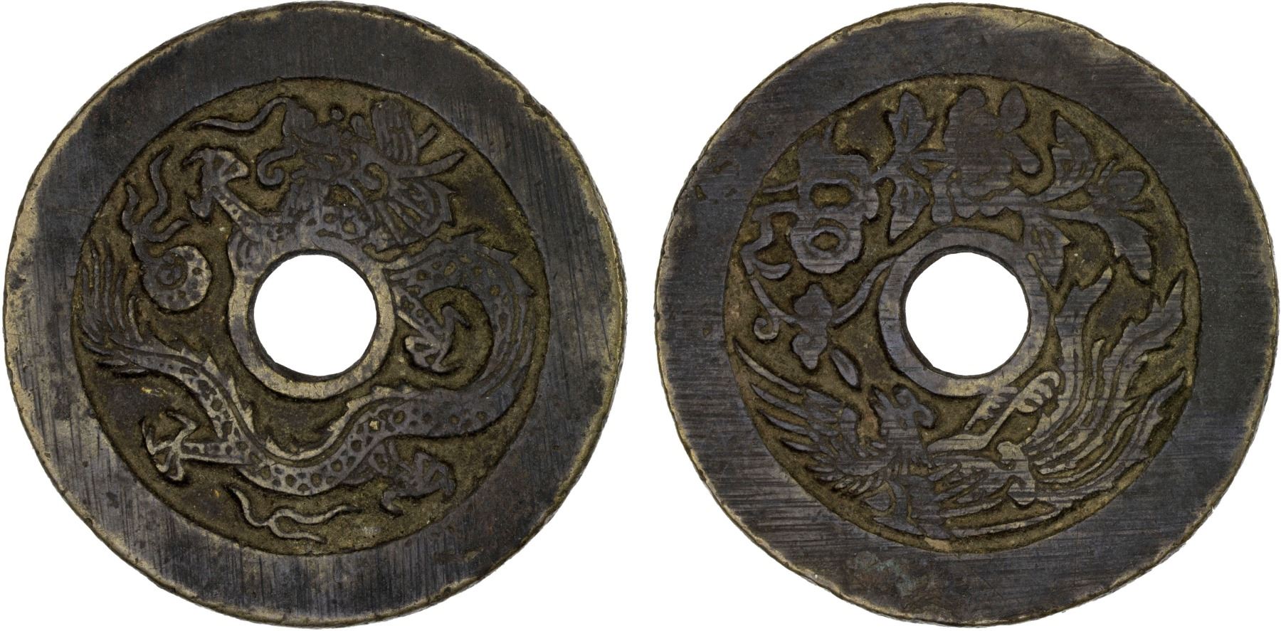 CHINA: AE charm (21.04g), CCC-527, 44mm, dragon with flaming pearl // phoenix with flower, likely cast in the late Qing dynasty, accompanied by old collector's ticket, VF.