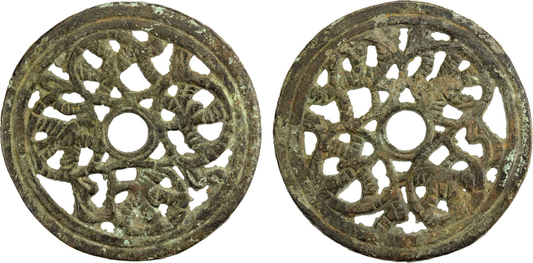 CHINA: AE charm (30.62g), Semans-380r var., 55mm openwork flower type, four lotuses, F-VF, ex Jürgen M. Wilmes Collection. "Open-work" charms are one of the major types of ancient Chinese charms. They are referred to in Chinese as lou kong qian "hollowed out" money and ling long qian "elegant" money. Chinese open work charms have irregular shaped "openings" between their exquisite design elements. They are round and almost always have a round hole in the center. Openwork charms became very popular and were often worn for personal adornment during the Song, Yuan, and Ming dynasties.