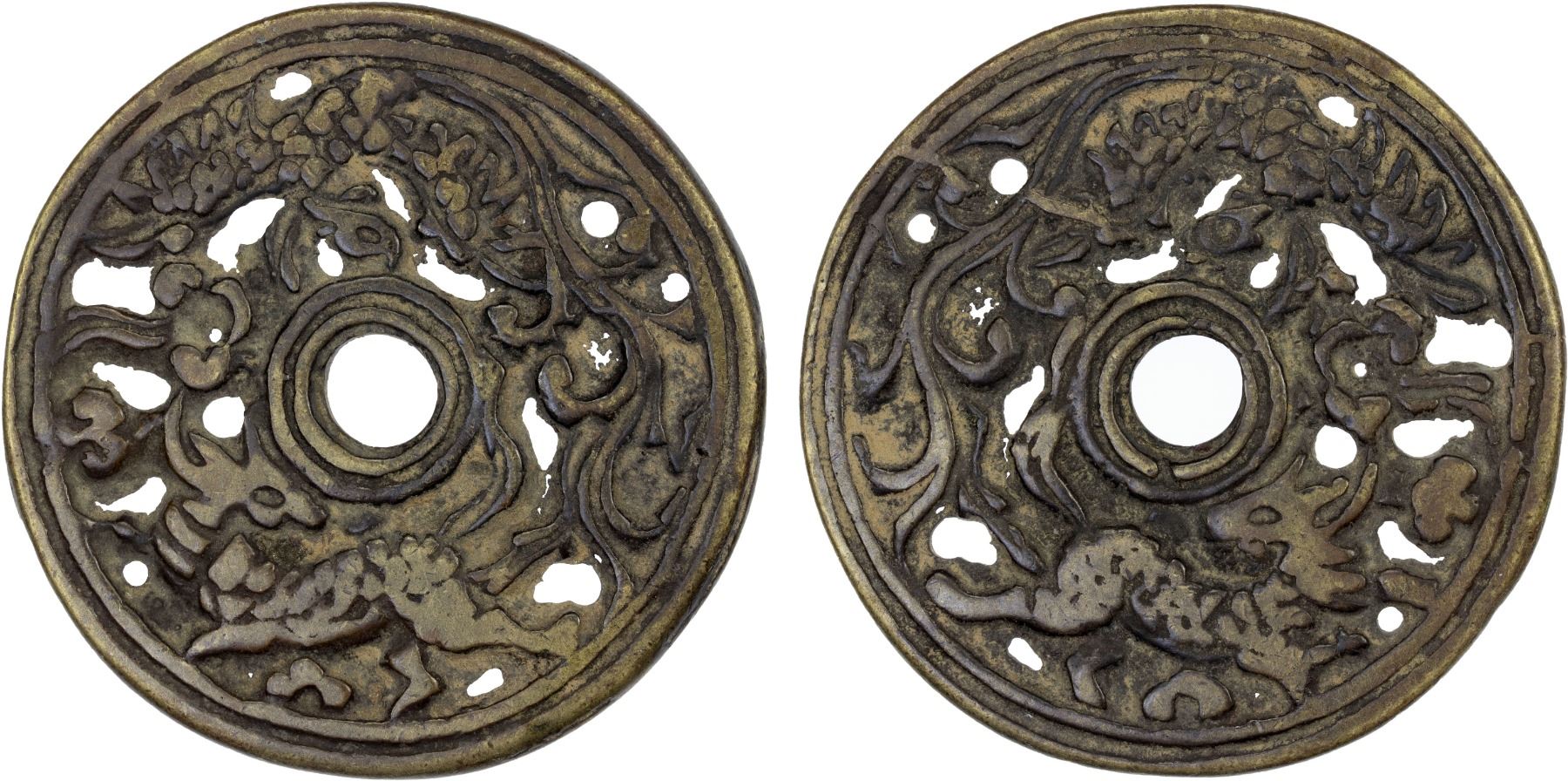 CHINA: AE charm (54.39g), Semans-234f, 63mm openwork animal type, Chinese unicorn (qilin) running with head reverted, phoenix flying above, VF. "Open-work" charms are one of the major types of ancient Chinese charms. They are referred to in Chinese as lou kong qian "hollowed out" money and ling long qian "elegant" money. Chinese open work charms have irregular shaped "openings" between their exquisite design elements. They are round and almost always have a round hole in the center. Openwork charms became very popular and were often worn for personal adornment during the Song, Yuan, and Ming dynasties.