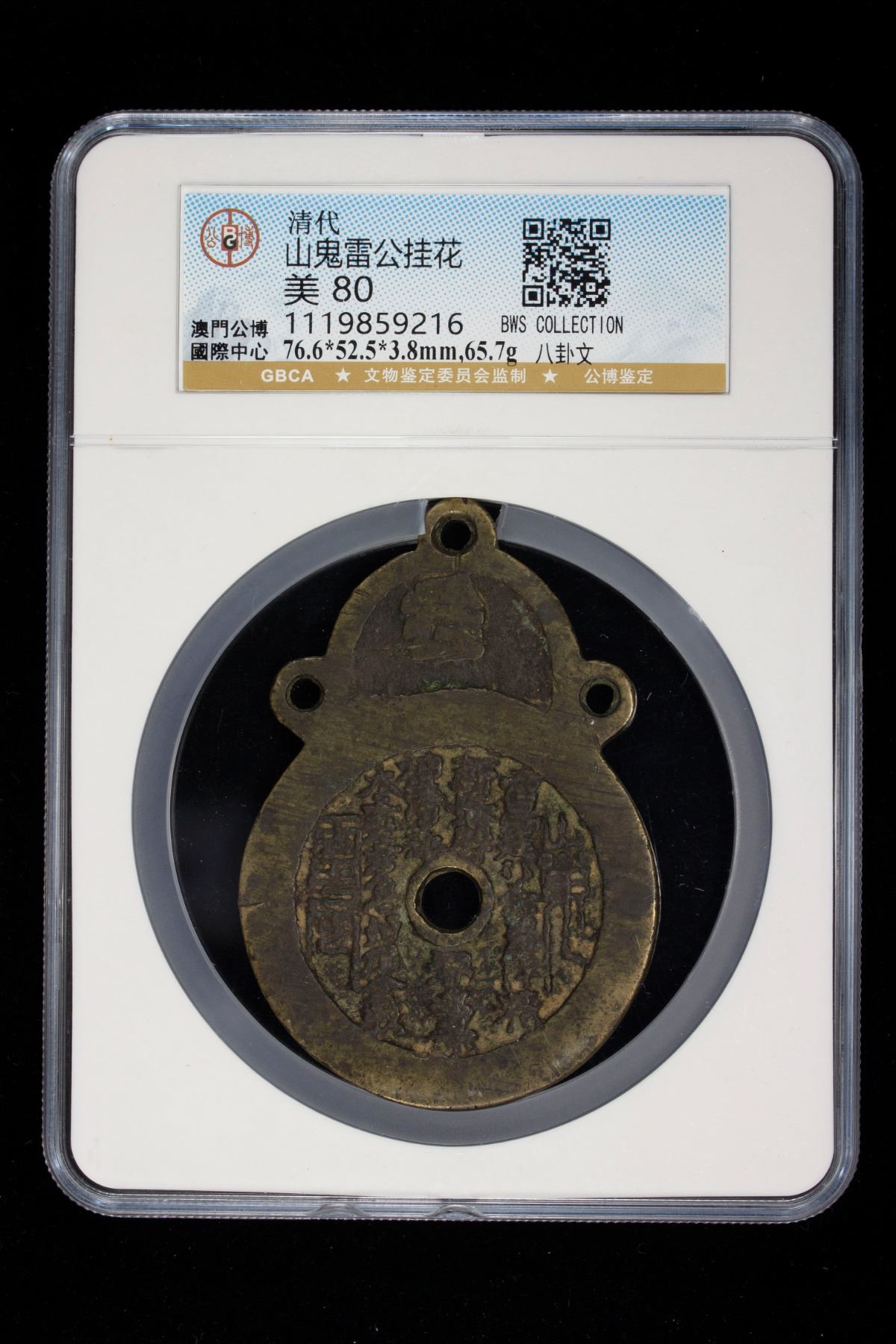 CHINA: AE charm (65.7g), Mandel-6.1.10, 77x53mm, Lei Ling hanging type "Daoist curse charm," lei zou sha gui jiang jing / zhan yao chu xie yong bao / shen qing feng / tai shang lao jun ji ji zhi ling, which translates as "God of Thunder (Lei) clear out and kill the ghosts and send down purity / Behead the demons / Expel the evil and keep us eternally safe / Let this command from Lao Zi be executed quickly" // eight trigrams with inscription qián kan gèn zhèn xùn lí kun duì around, graded 80 by GBCA Grading Company, VF, ex Bruce W. Smith Collection. The large characters at the extreme right and extreme left of the obverse are not Chinese, but rather Daoist "magic writing." Regarding the very large character on the left, the upper half is "magic writing" for the Chinese character lei, which means "thunder" and refers to the "God of Thunder." The lower part is "magic writing" for the Chinese character ling, which means "to order." This charm type was likely cast in the Qing Dynasty. The Bruce W. Smith Collection was formed in the United States from the 1960s through the 1990s.