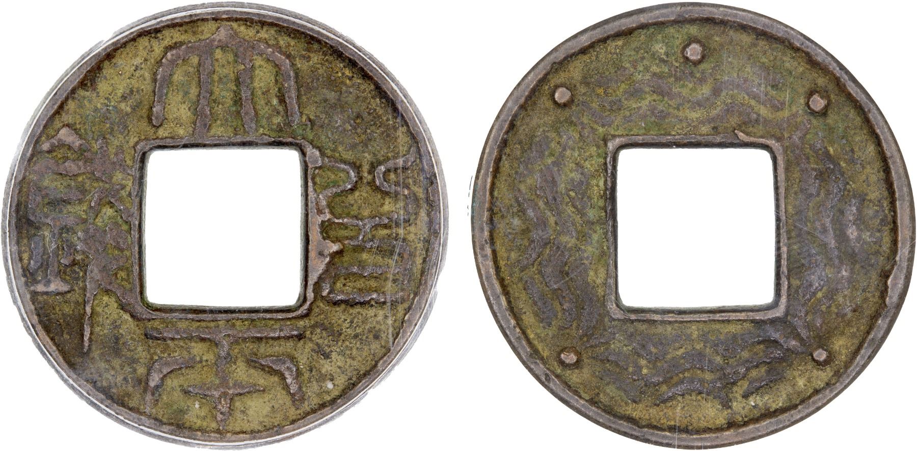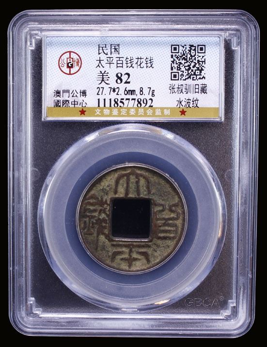 CHINA: AE charm (8.7g), 28mm, tai ping bai qian, with water wave pattern and pellets on the reverse, graded 82 by GBCA Grading Company, VF, ex Nai-Chi Chang Collection. Likely cast in the early Min Guo (Republic) era.