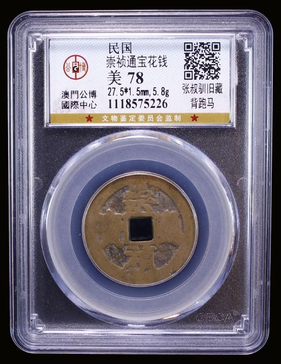 CHINA: AE charm (8.7g), 28mm, chong zhen tong bao, with running horse above on reverse, graded 78 by GBCA Grading Company, VF, ex Nai-Chi Chang Collection. Likely cast in the late Qing dynasty or the early Min Guo (Republic) era.